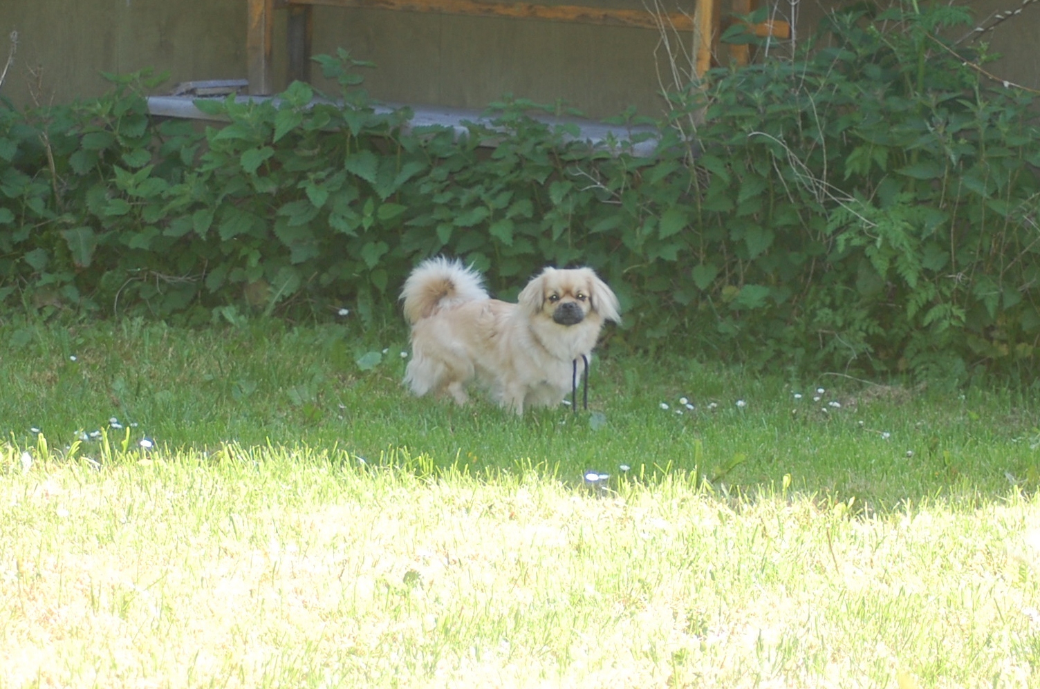 hjem til deres egen familie i dag , men det har været en fornøjelse at have dem her som gæster i de 14 dage det blev til, inden deres ” mor ” ikke kunne undvære dem længere. Jeg måtte jo prøve om jeg ikke kunne få nogle billeder af dem alle tre ude i haven, men især ville jeg gerne have billeder af Kitzi, som havde undgået mit kamera indtil nu. Jeg har jo sat farvede bånd i deres halsbånd, rødt for Kitzi, grønt for Ally og blåt for Jolene, for især de to søstre synes jeg at det er
