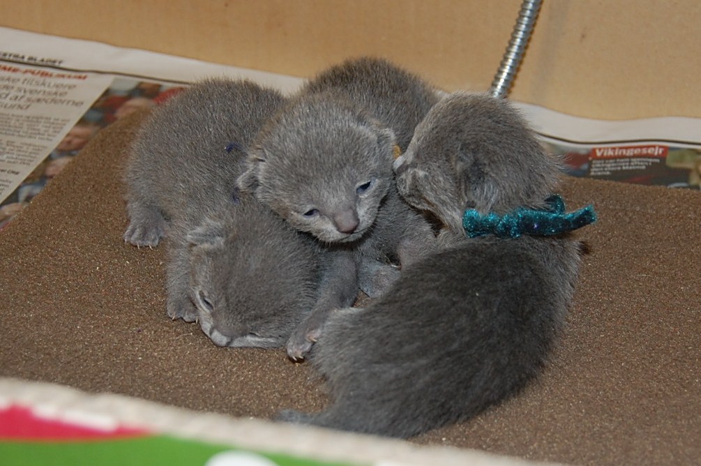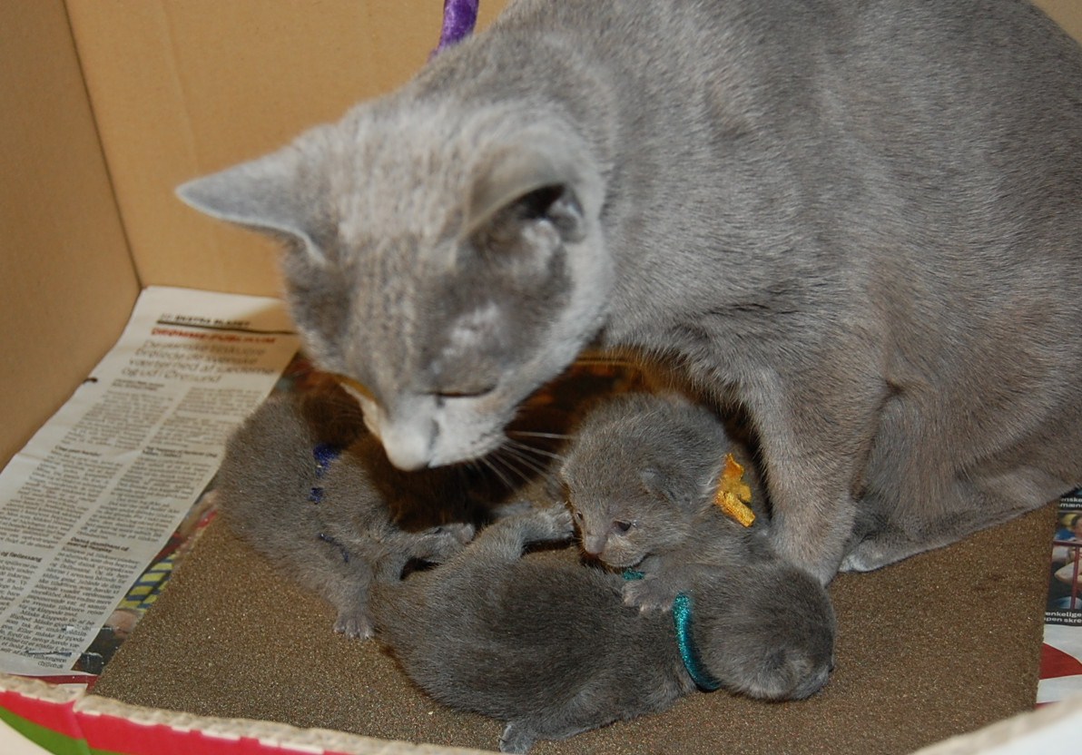 er nu taget af mine små russer killinger, der skal hedde noget med E. Nu begynder de at røre sig mere og jeg er jo stadig forundret over så lidt jeg hører dem. Jeg tror jo at det har noget at gøre med den nye varmeplade jeg købte til dem, og så at Xantippe er sådan en kærlig omsorgsfuld mor.