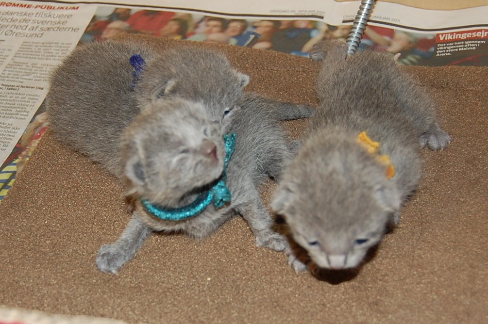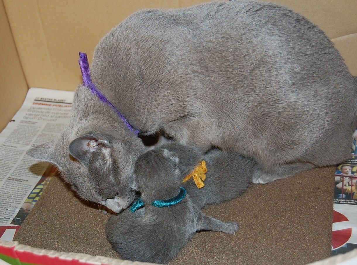 Endelig kom fødslen i gang. Jeg havde jo talt dagene fra den første parring og så er dagene ekstra lange mens man venter på at det skal blive til noget med de utålmodigt ventede killinger. Indtil nu er der født to livkraftige dejlige små misser og jeg har fotograferet deres bagdele så alle er velkomne til at gætte på kønnet.