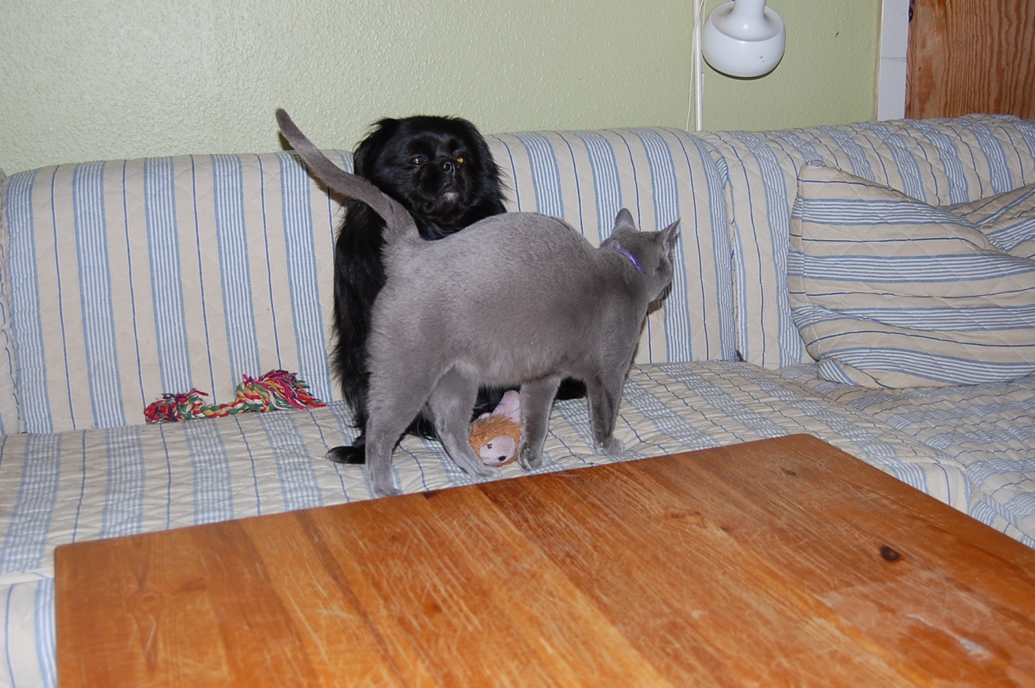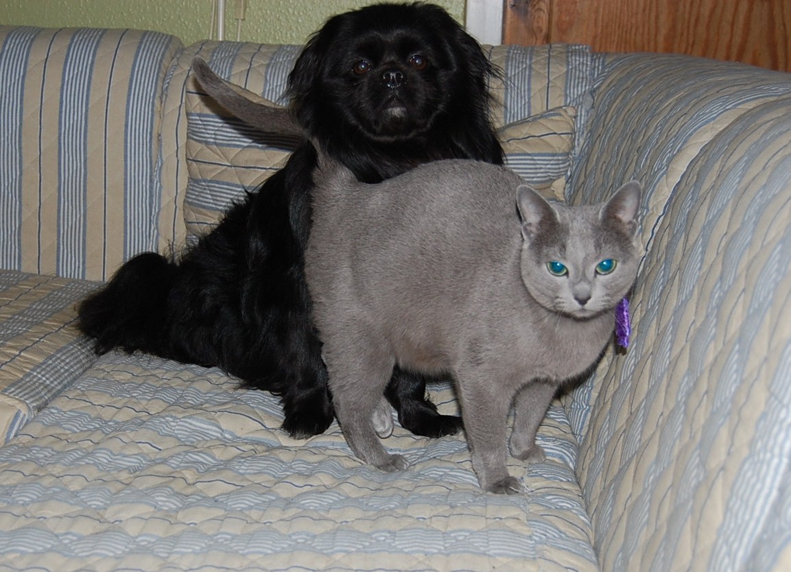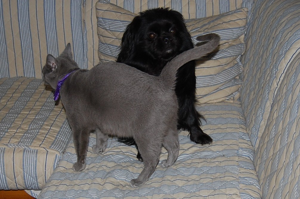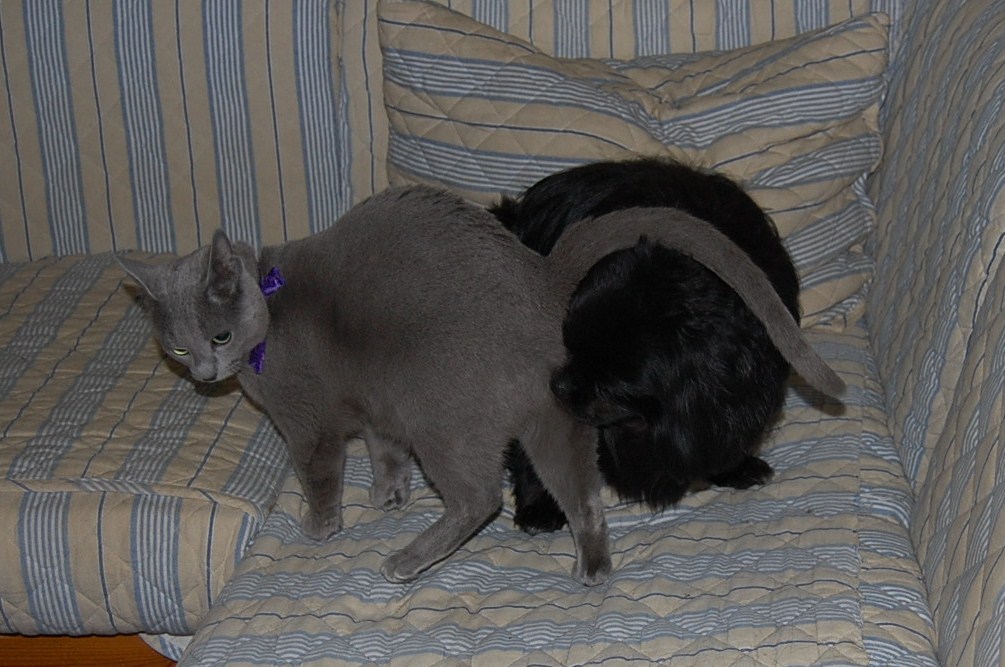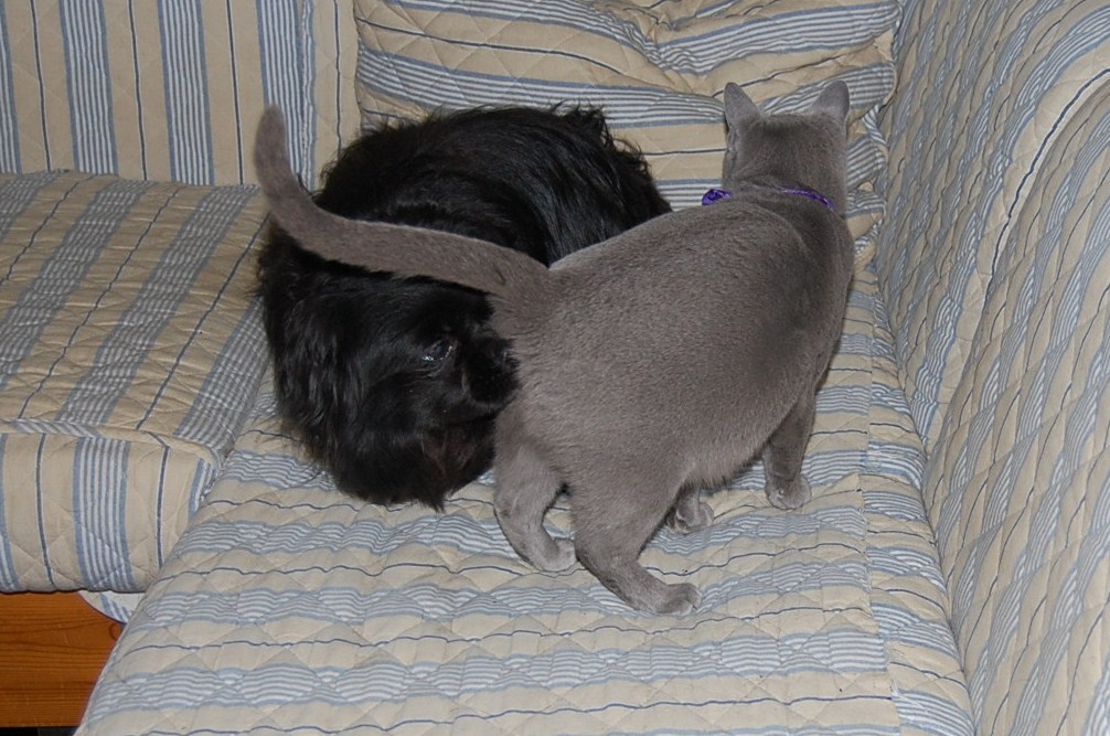 I dag fik jeg taget nogle billeder af min høj gravide hunkat Xantippe, der fandt min hanhund Oliver oppe i sofaen. Den måde de to opførte sig på og Oliver`s store interesse i Xantippe`s bagdel, får mig til at tro at hendes fødsel er meget nært forestående. Spændende om jeg får ret !