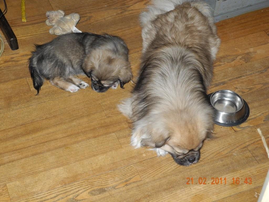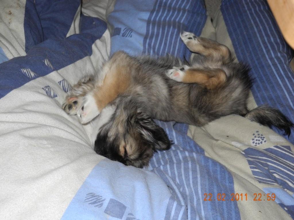 ganske almindelige hunde ? Ja efter ejerens mening kommer det ganske an på hvornår du ser på dem, for lige så vilde i en god gang tagfat, de kan være, lige så totalt afslappede kan de også være. Det er ikke engang nødvendigt at gå pænt i seng, næ man vælter et tilfældigt sted på gulvet og så tager man en lille lur. Ind imellem er der skam også tid til at fornøje sig med almindelige hvalpeforlystelser , såsom at trække mors striktrøje ned på gulvet eller gnave i hende sandaler. Joukki forstår at få ting til at ske, når der er for roligt i huset og hvis han synes at mor sidder alt for roligt ned, så skal han jo bare gå lidt søgende rundt ved hjørnerne, så kommer mor hurtigt op af stolen.
