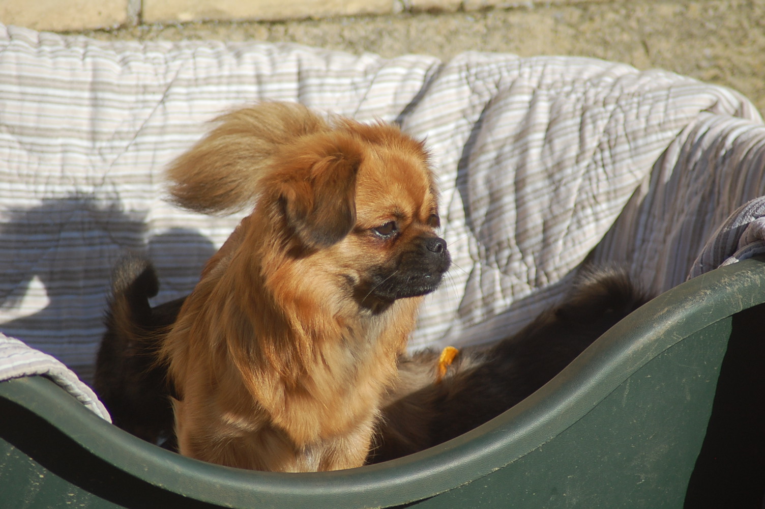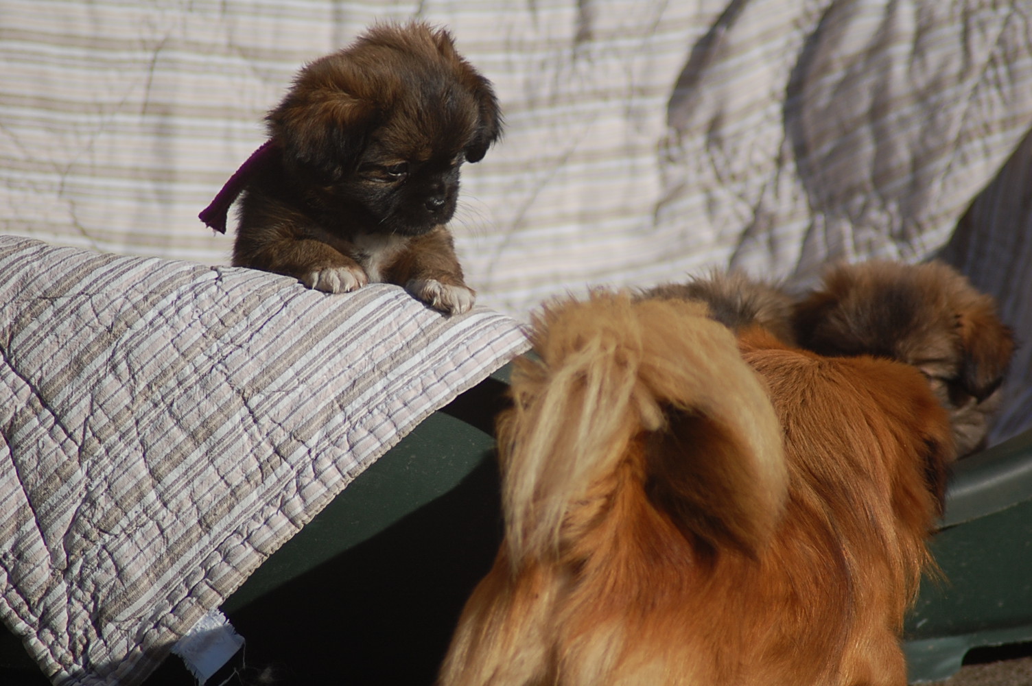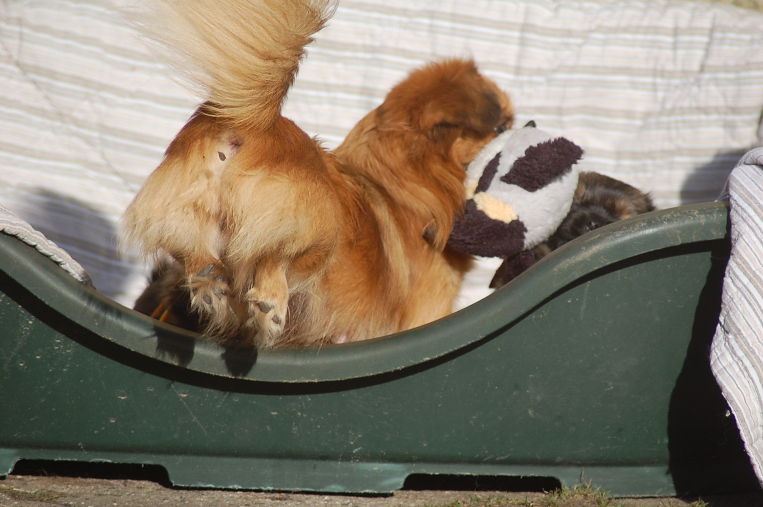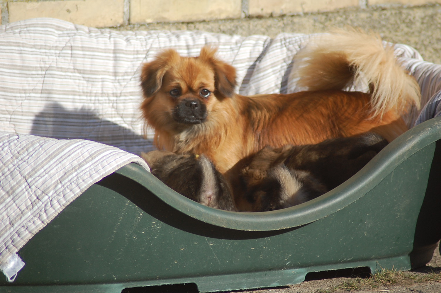 I dag kom solen og jeg fandt et sted hvor jeg kunne stille den store hundeseng så den var nogenlunde i læ, så hvalpene måtte lige lidt udenfor og få lidt frisk luft. De fik selvfølgelig deres mor med og lidt legetøj og så har man faktisk det hele når man er en lille hvalp.