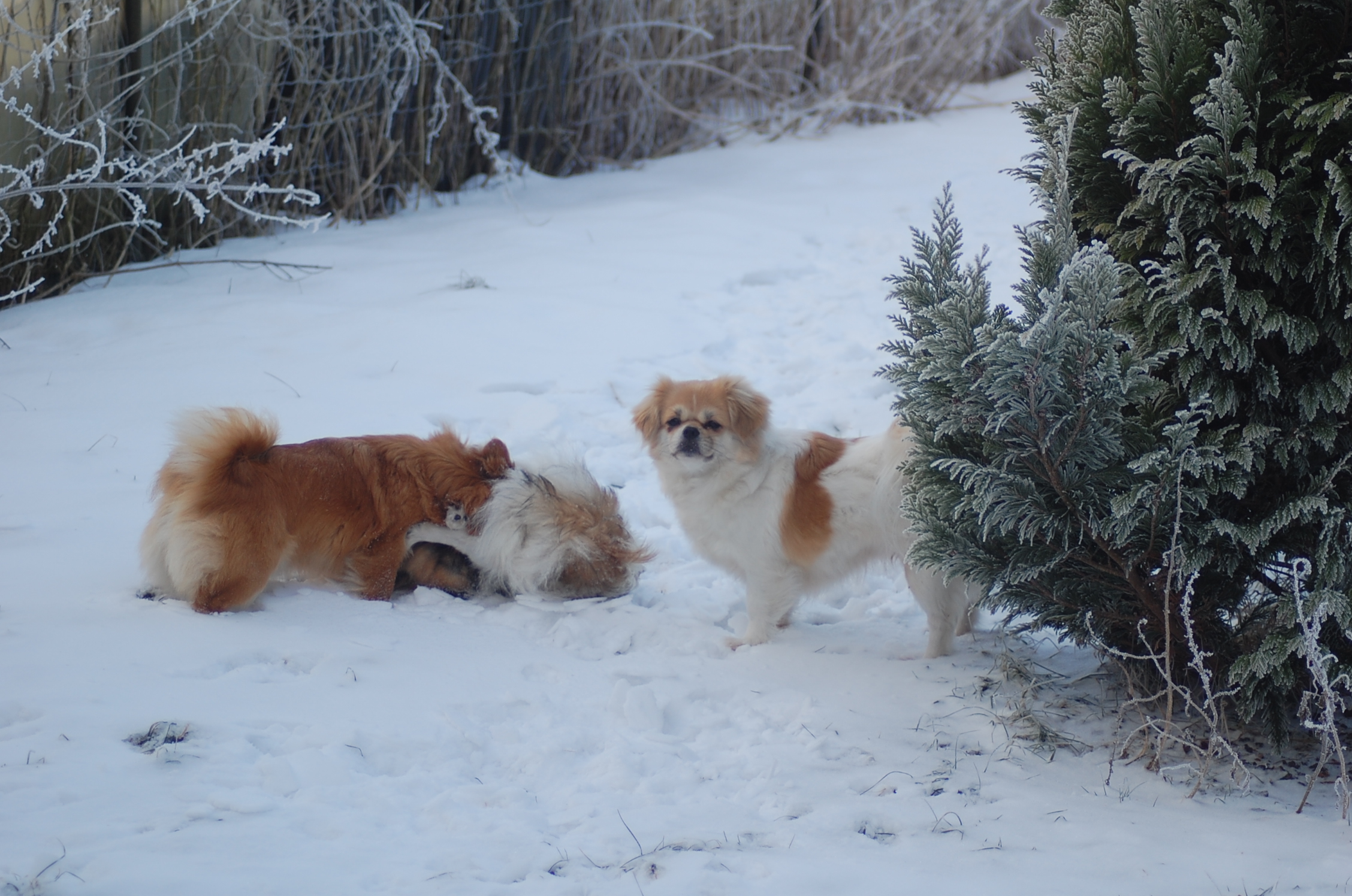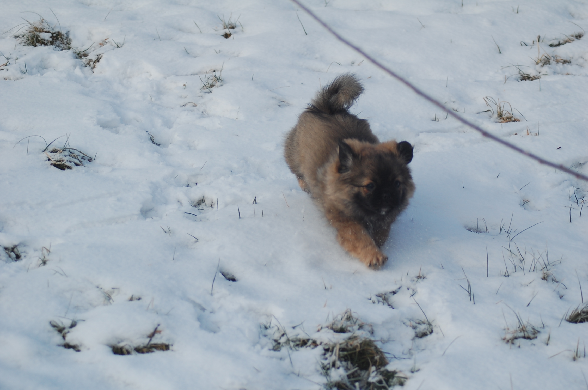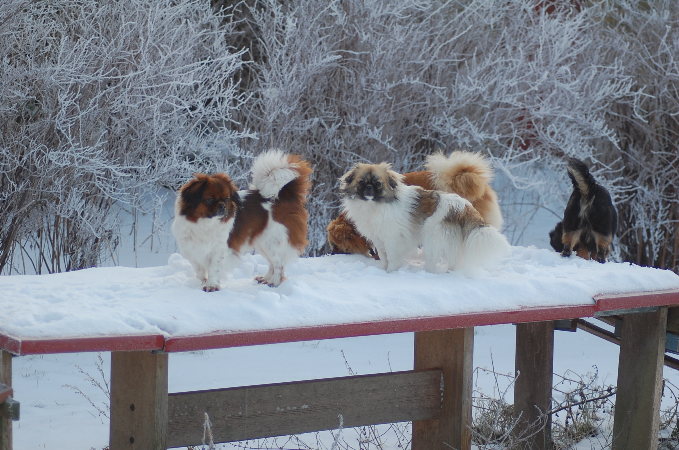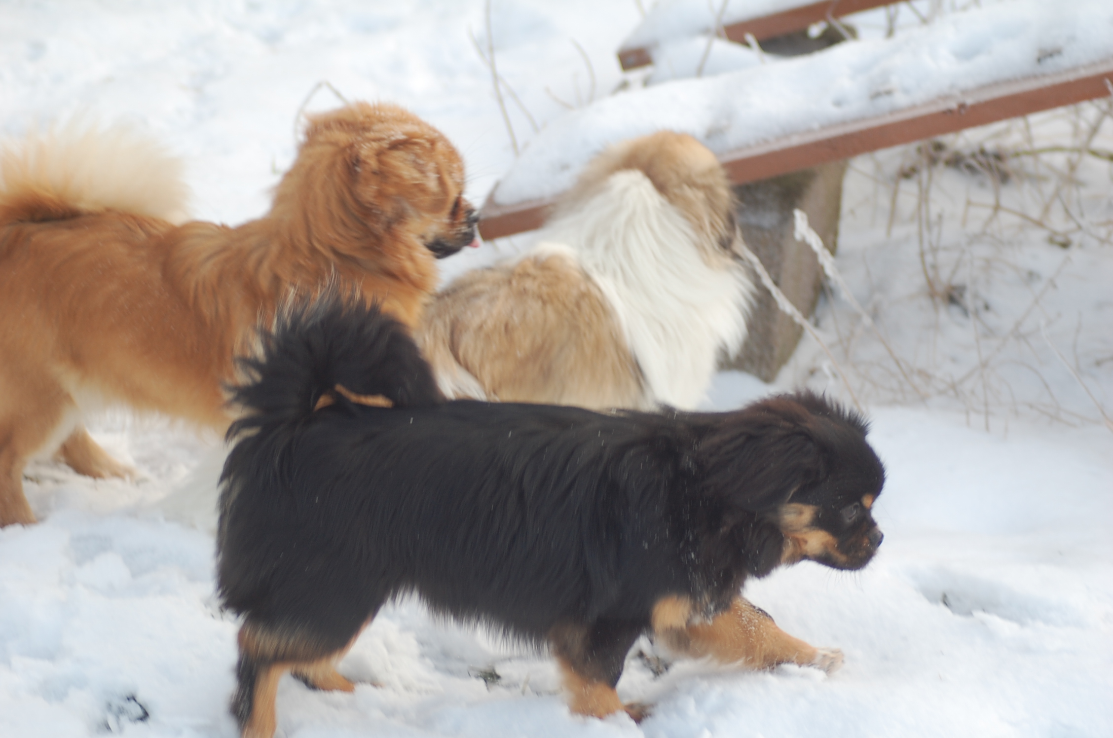 Efter mange dage uden sol nyder hundene at komme ud i haven når solen skinner og det ikke blæser. Det er vanskeligt at tage billeder når hundene har så meget krudt i sig de skal have brændt af, men der blev da nogen stykker der ikke blev helt tågede.