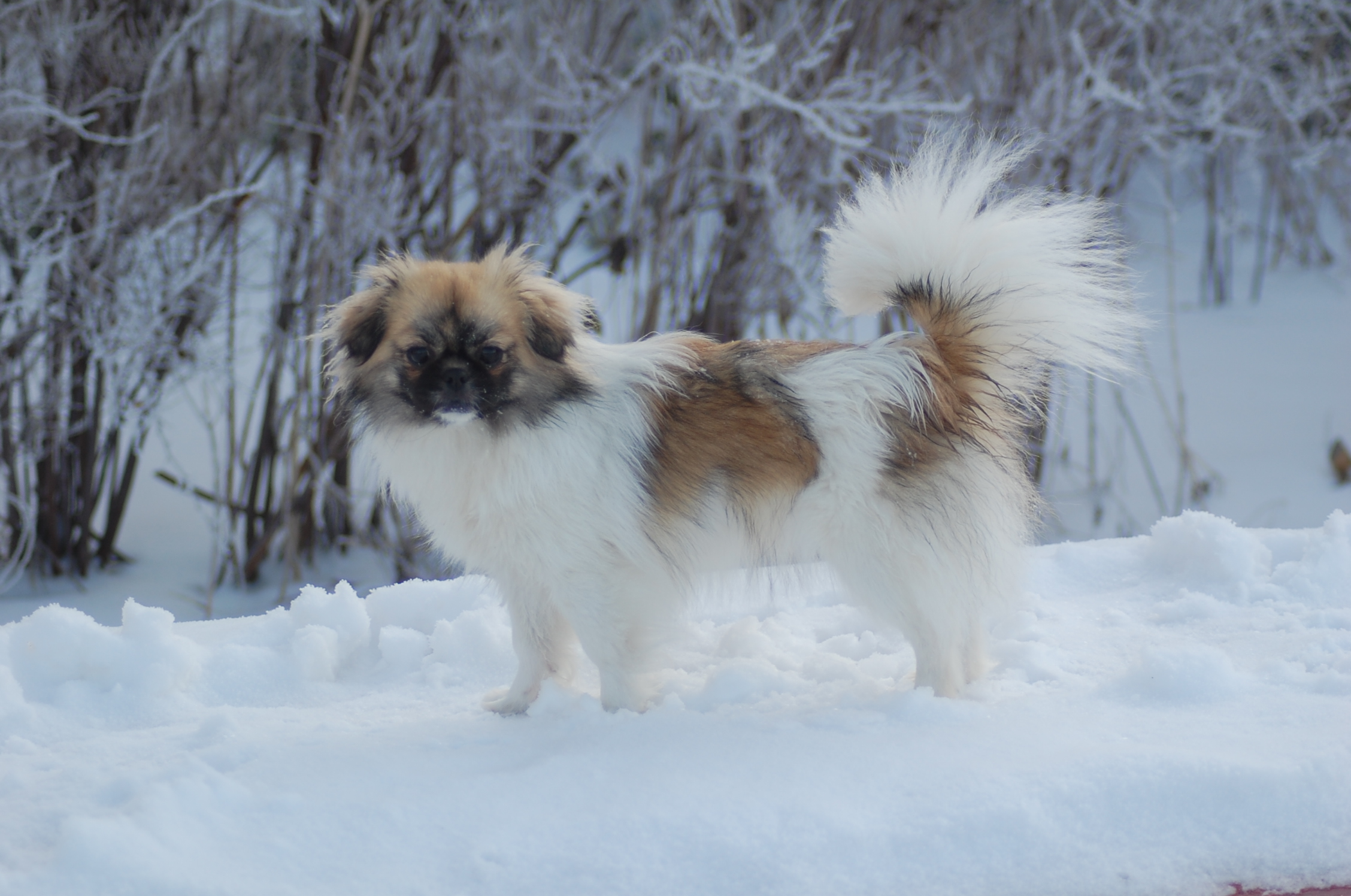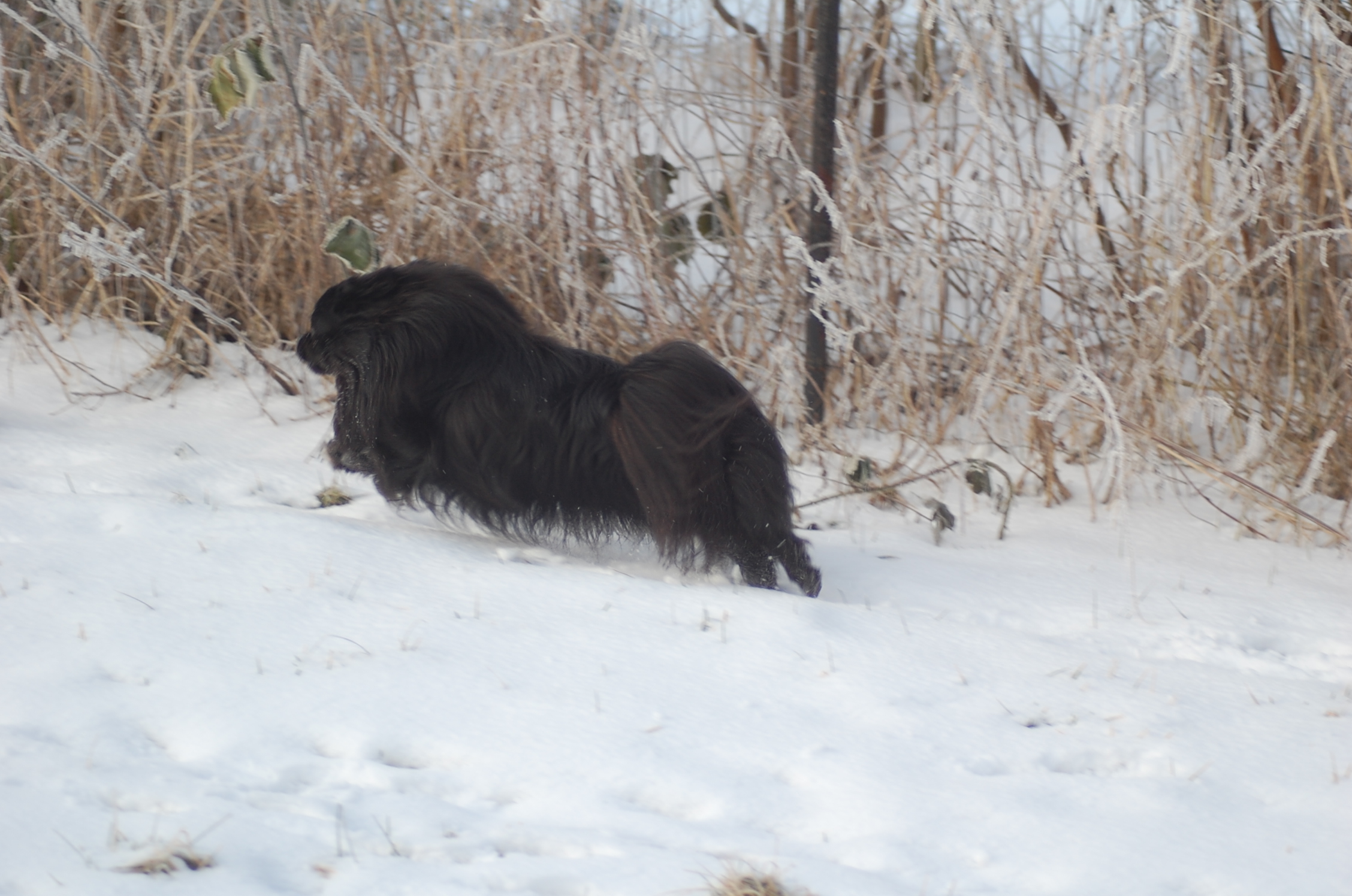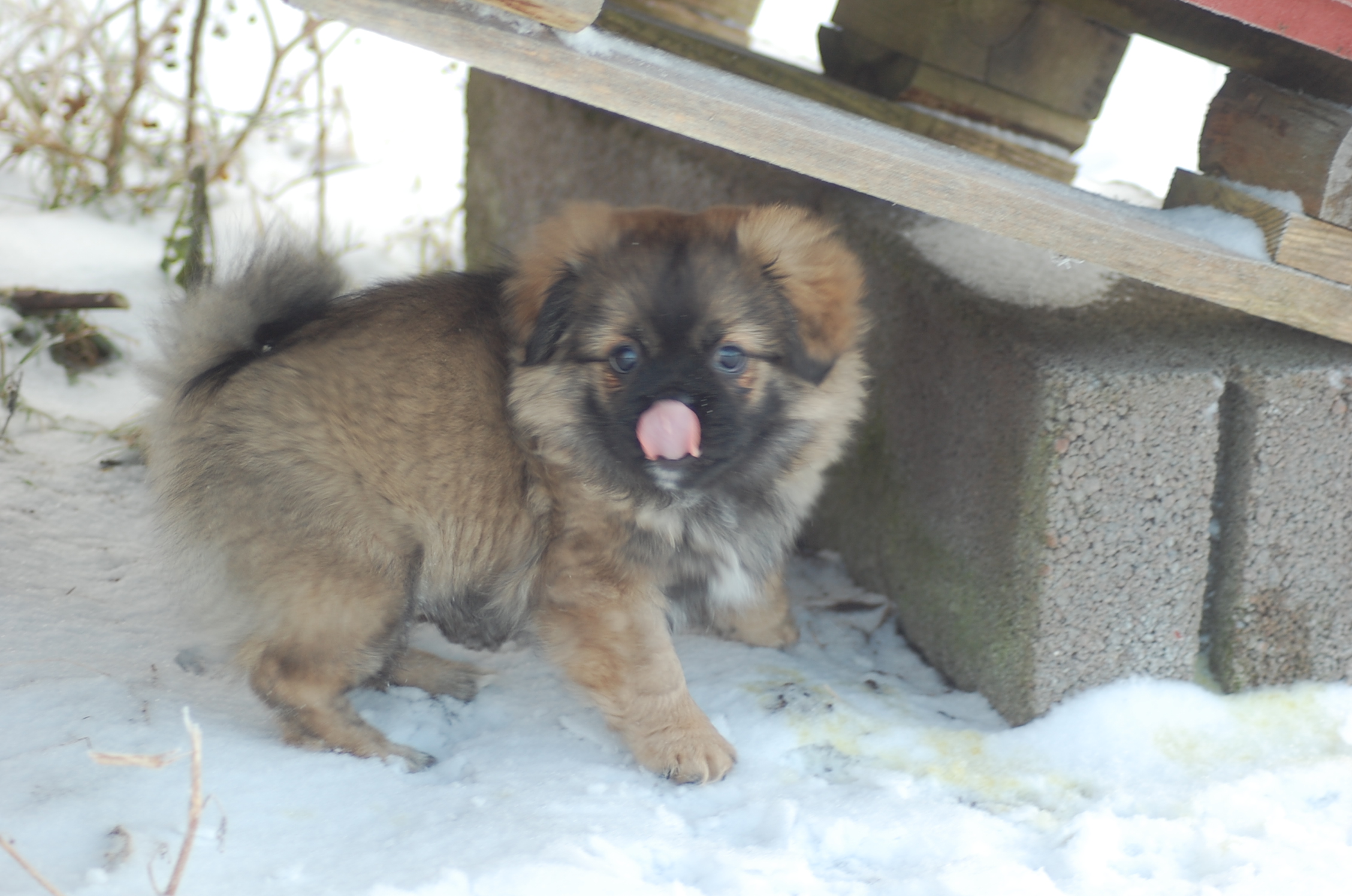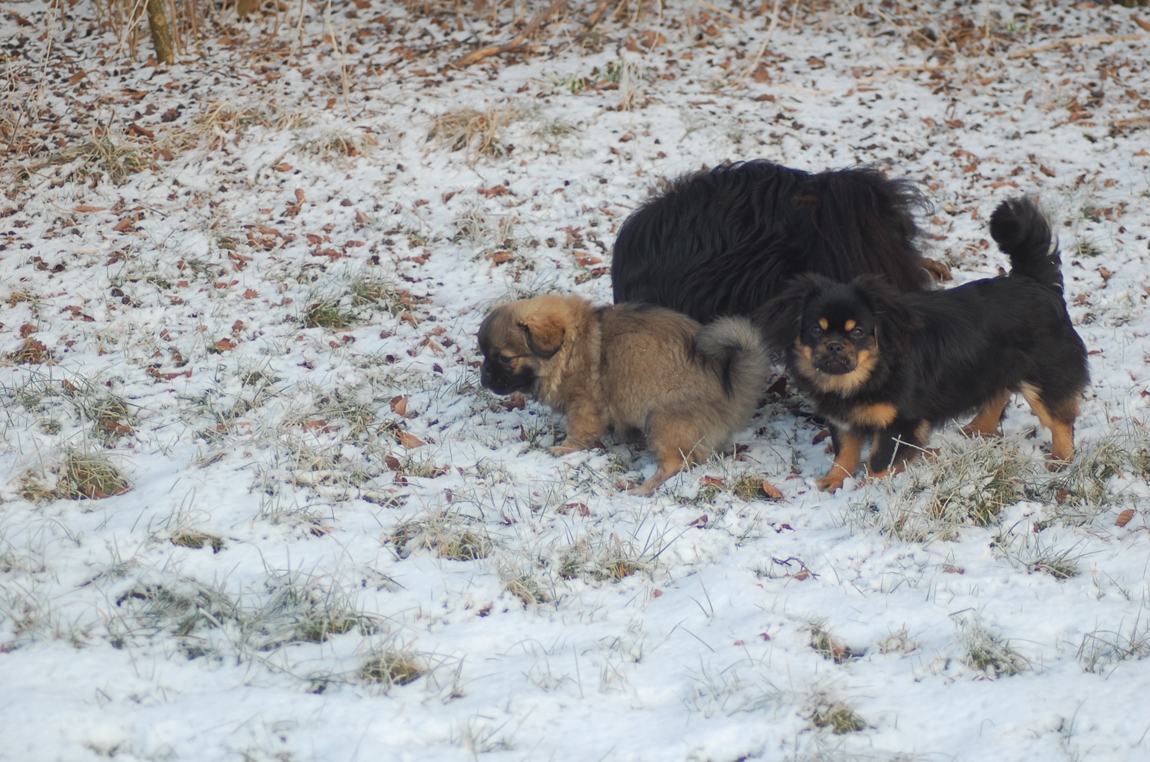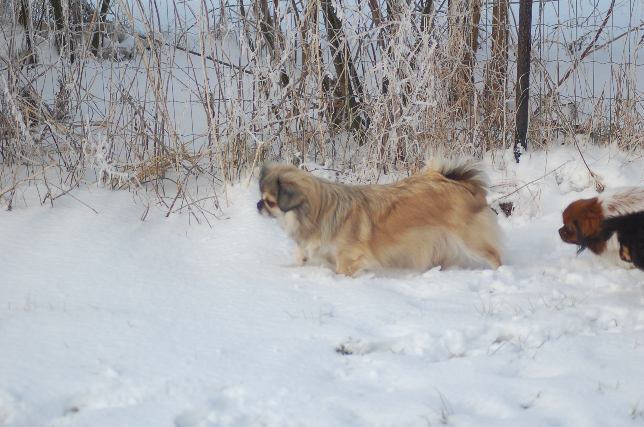 Efter mange dage uden sol nyder hundene at komme ud i haven når solen skinner og det ikke blæser. Det er vanskeligt at tage billeder når hundene har så meget krudt i sig de skal have brændt af, men der blev da nogen stykker der ikke blev helt tågede.