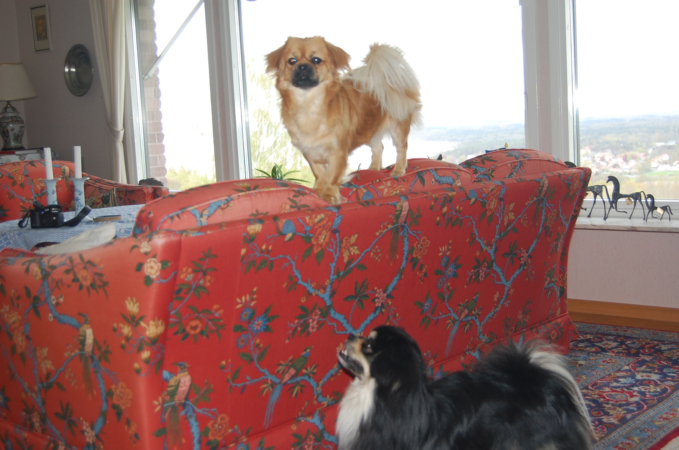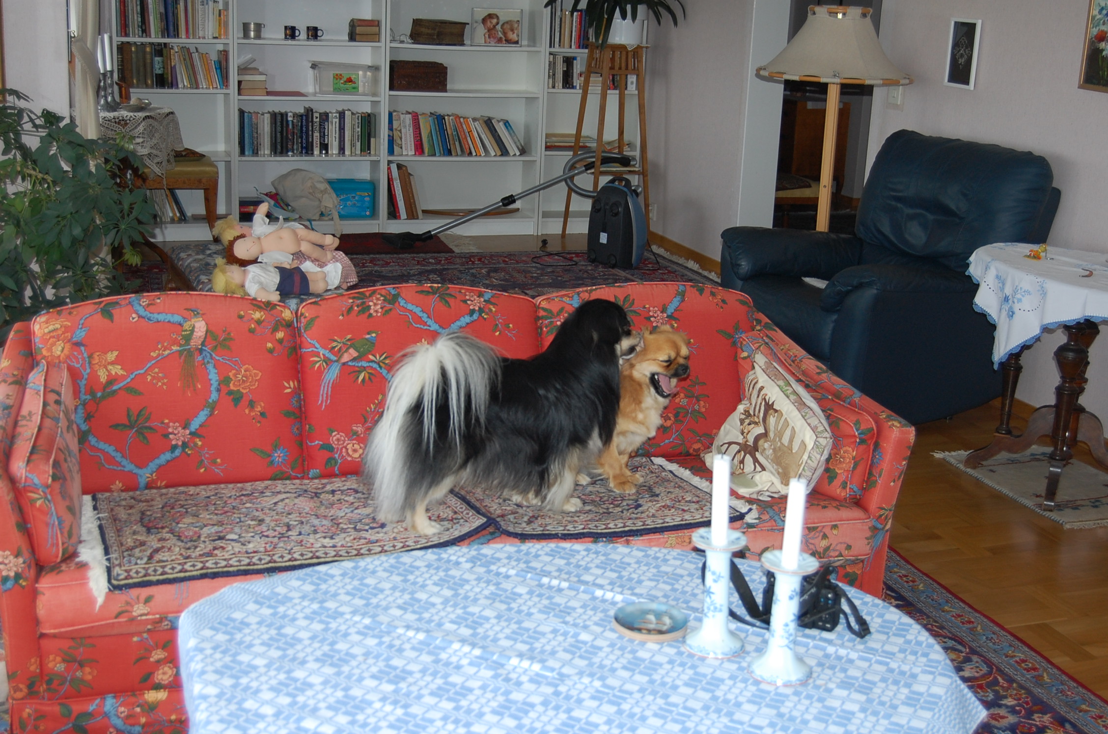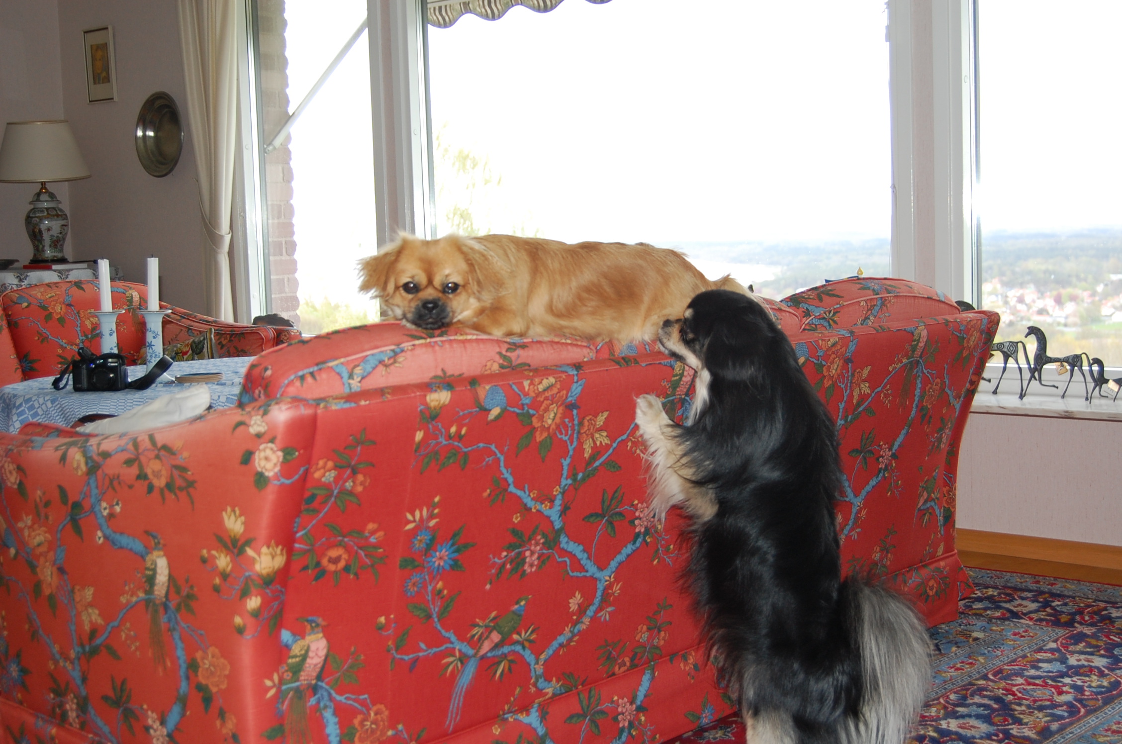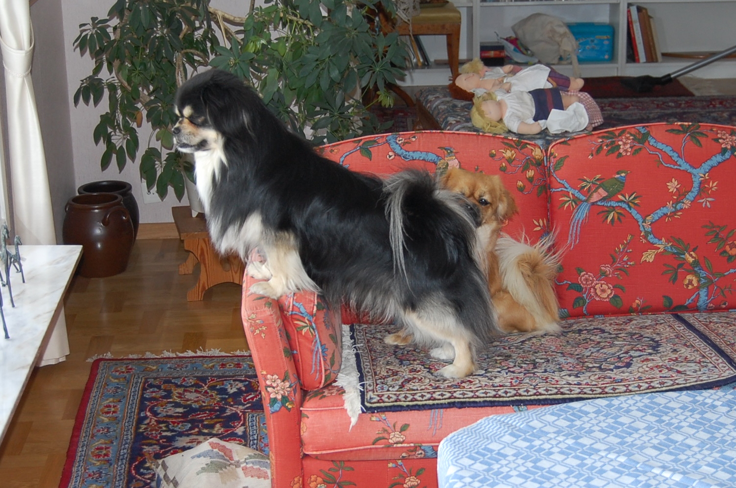Ruby er i løbetid og det var bestemt at hun skulle parres, så der blev diskuteret forskellige mulige lækre fædre til hendes hvalpe. Vi blev enige om at dejlige Milton, der er black og tan, var et godt bud. For at være helt sikre på at hun var klar, tog vi til dyrlægen mandag morgen og fik taget en progesteron test. Testen viste at hun var endog meget klar selvom det kun var 9. dag i løbetiden, så dyrlægen sagde kør med det samme. Bilen var pakket og klar, så det varede ikke længe før vi var på vej. Vi kom godt over til Sverige og fandt også fint hvor vi skulle hen, men så var det ligesom om det begyndte at gå lidt mindre glat. Milton blev meget interesseret i den dejlige tibbe frøken vi præsenterede for ham og han opførte sig helt efter reglerne og kurtiserede den skønne jomfru nænsomt, men ihærdigt. De var så søde sammen når de legede, og han fik lov til at kysse og slikke alt det han ville, men når han nåede til at lægge en pote op på hendes ryg, så var det slut med idyllen. Så sagde hun stop, og det så voldsomt så stakkels Milton røg flere skridt baglæns for ikke at blive bidt. Vi tænkte nok, at det jo også var første gang for hende, og vi prøvede at hjælpe dem ved at holde hende og snakke med hende imens, men det kunne simpelthen ikke lade sig gøre, for frøkenen ville ikke ! Vi regnede med at det ville gå bedre næste dag, når de havde kendt hinanden lidt længere, men det blev faktisk bare værre, og så kørte vi skuffede hjem igen. Da vi kom hjem igen skyndte Ruby sig hen til hegnet hvor Oliver var bagved og skubbede bagdelen hen imod ham. Der var han jo , hendes fæstemand, og hun havde gemt sin dyd til ham, ja hun var faktisk meget klar til at blive parret, og indtil nu er hun parret med Oliver to gange og jeg tror ikke at de er færdige med det endnu.