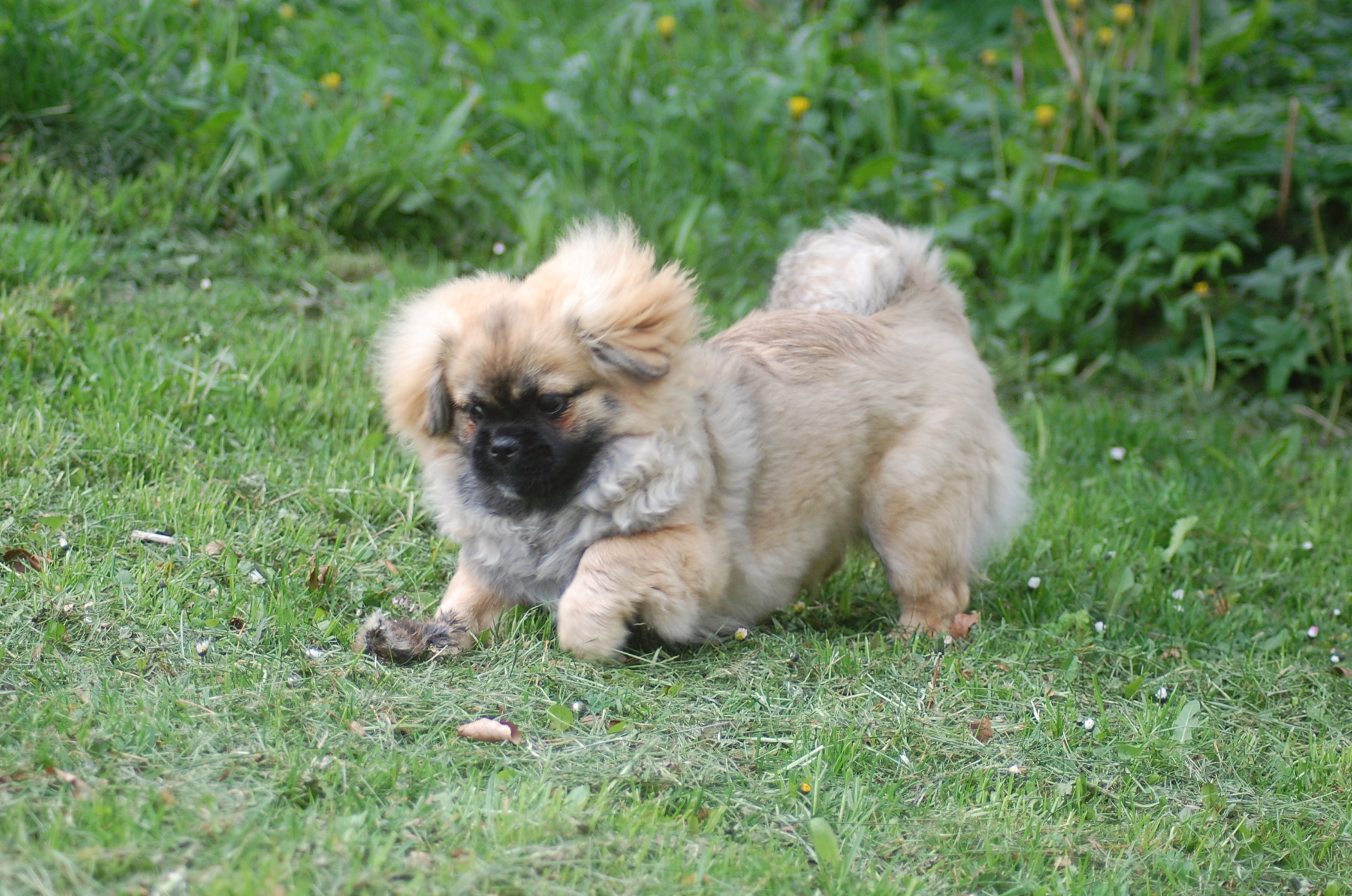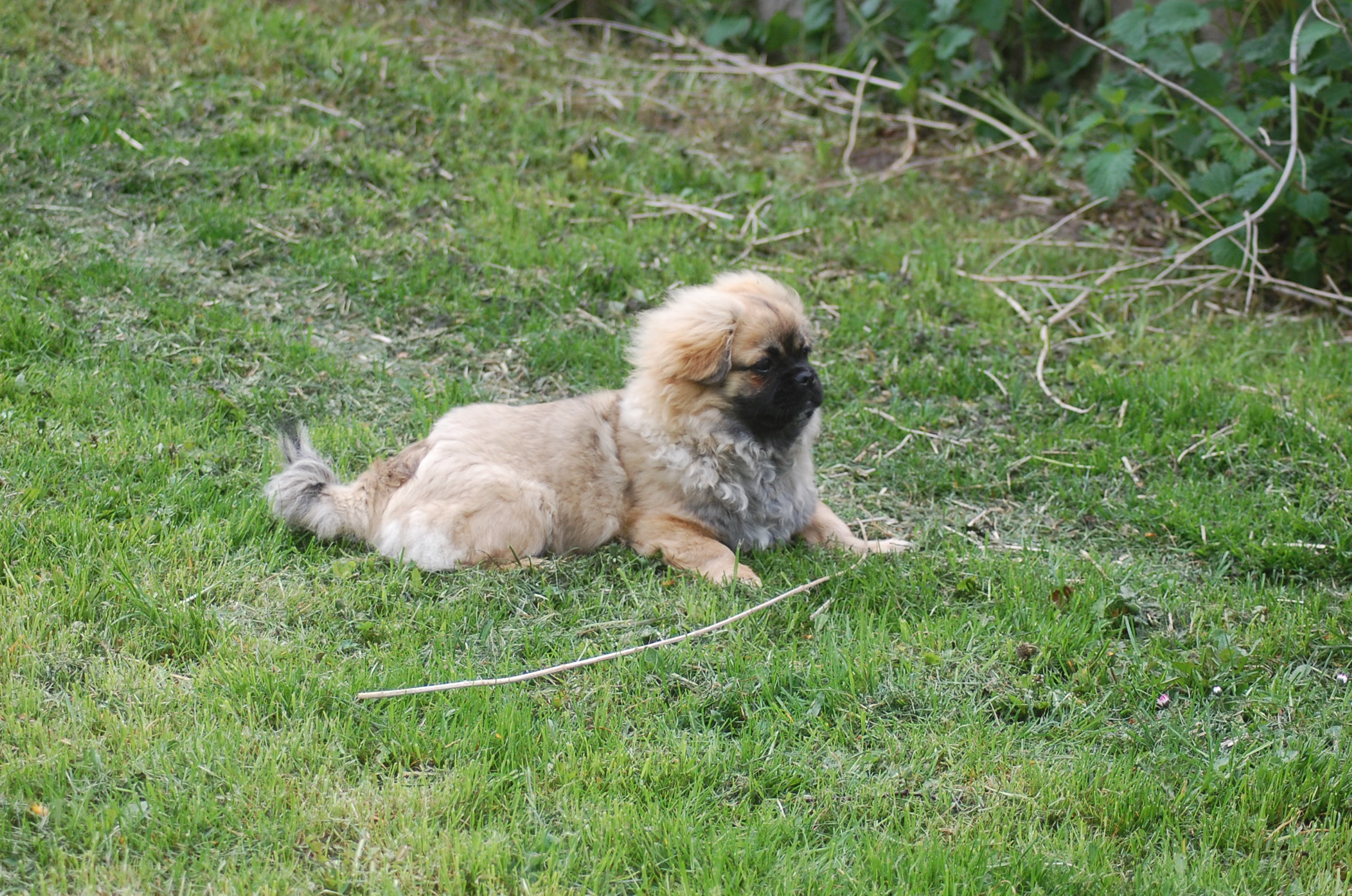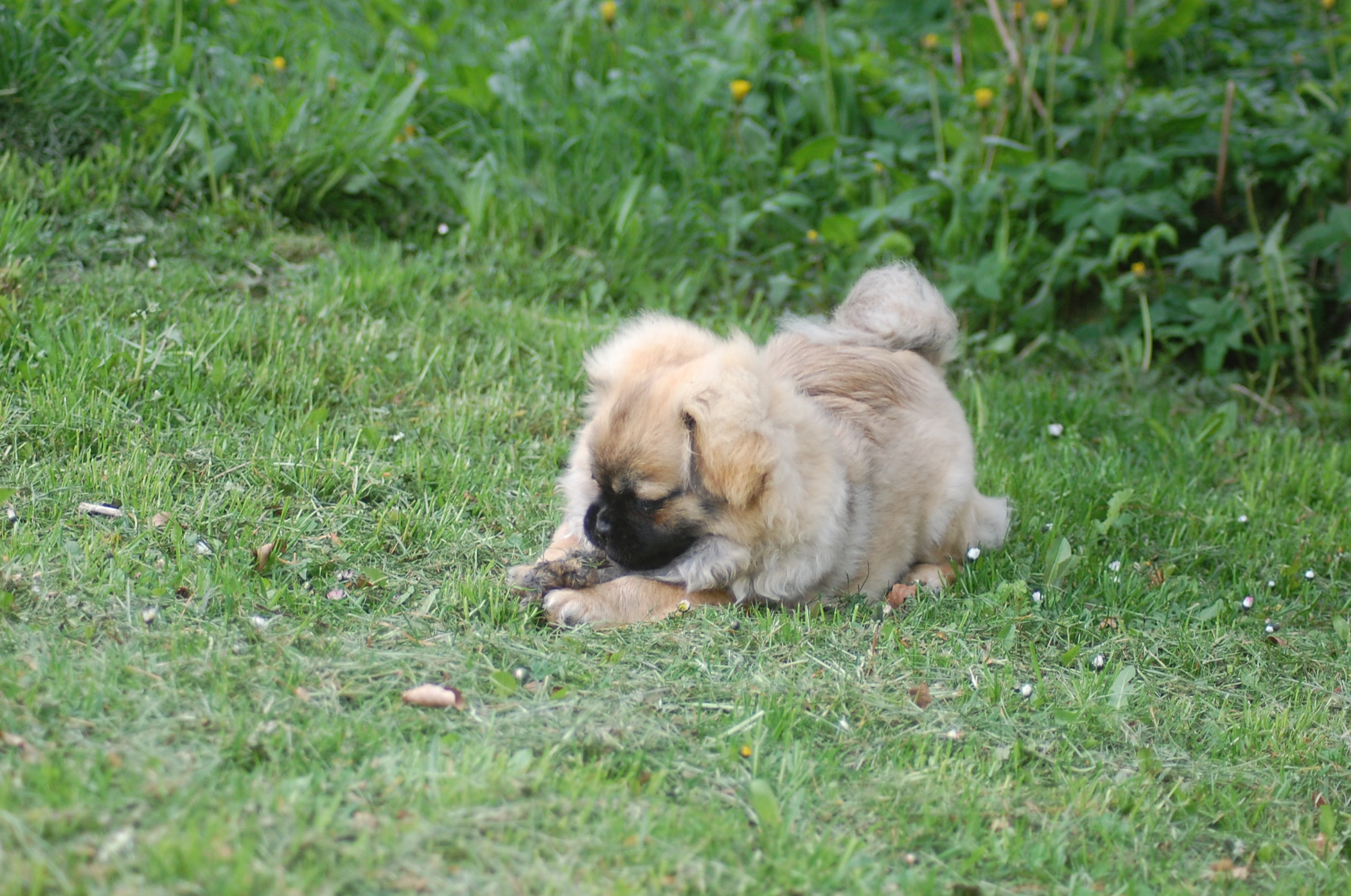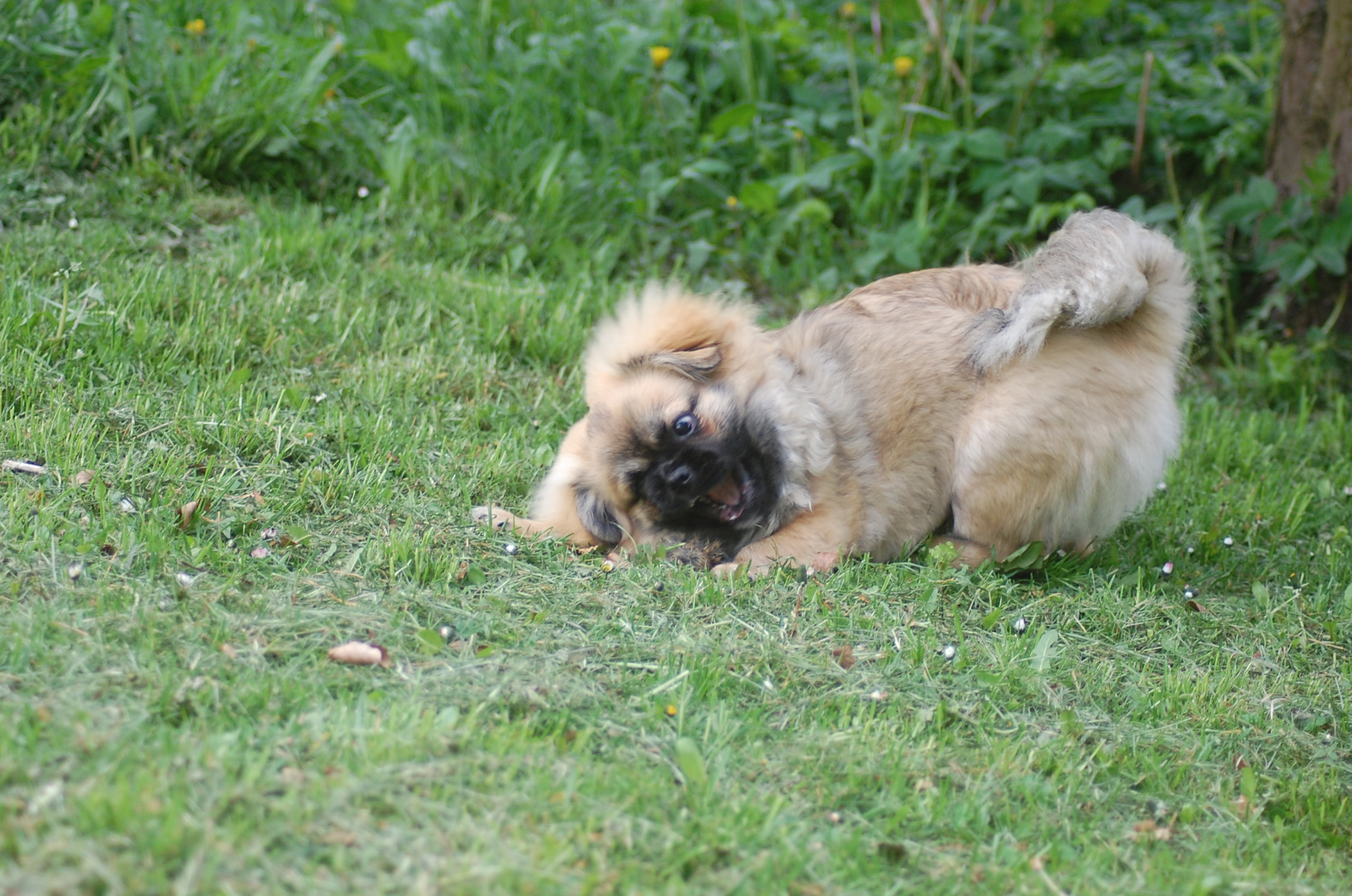 er blevet en rigtig lækker hund og jeg tror han ved det. Han er lidt svær at tage billeder af fordi han er så selskabelig at han helst vil være lige ved siden af mig hele tiden. Ude i haven fandt han et lille stykke skind som hundene har fået at lege med og de andre har tabt interessen for det men for Monty var det nyt, så det blev grundigt undersøgt indtil der var andre spændende ting der fangede interessen.