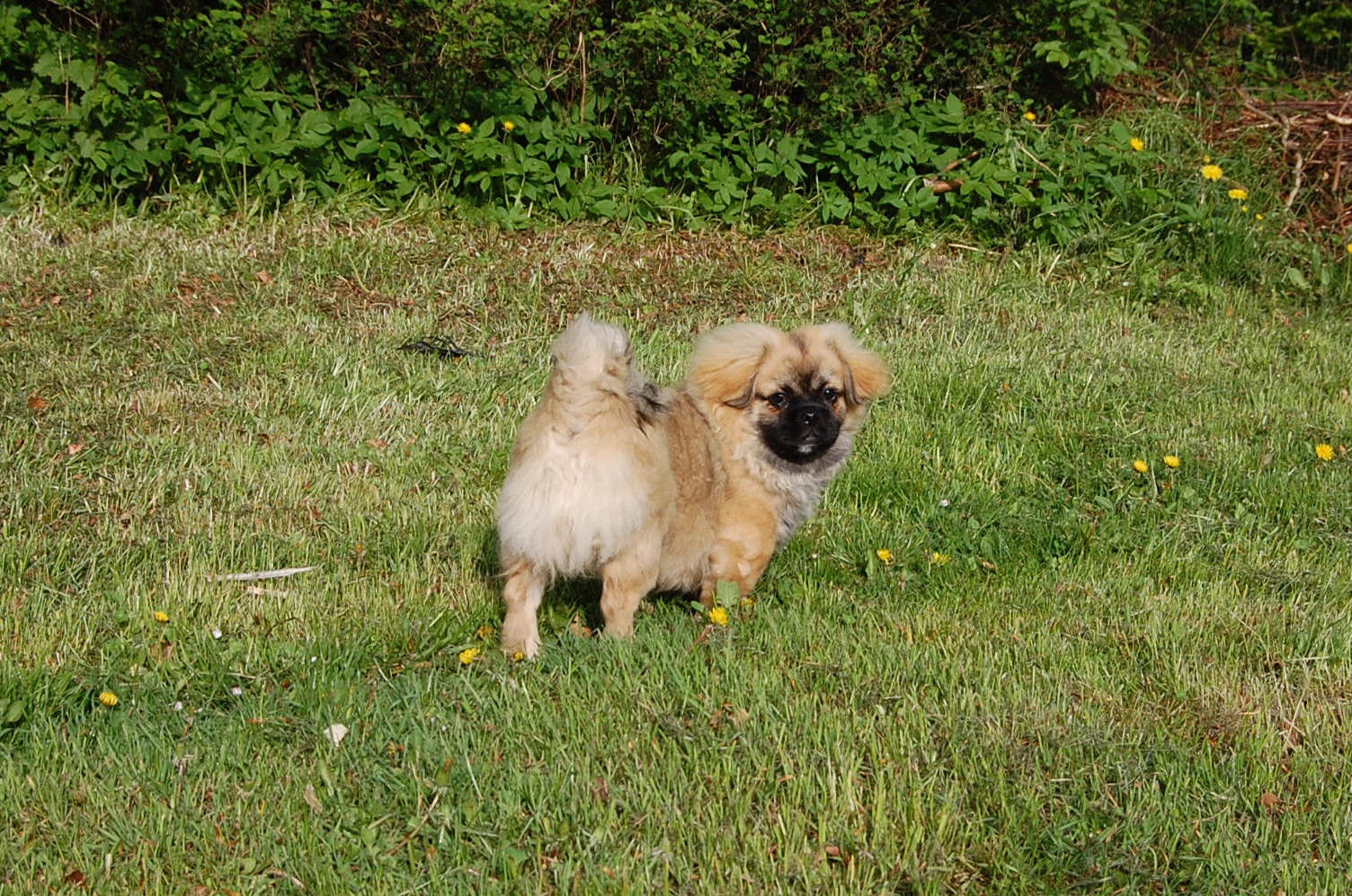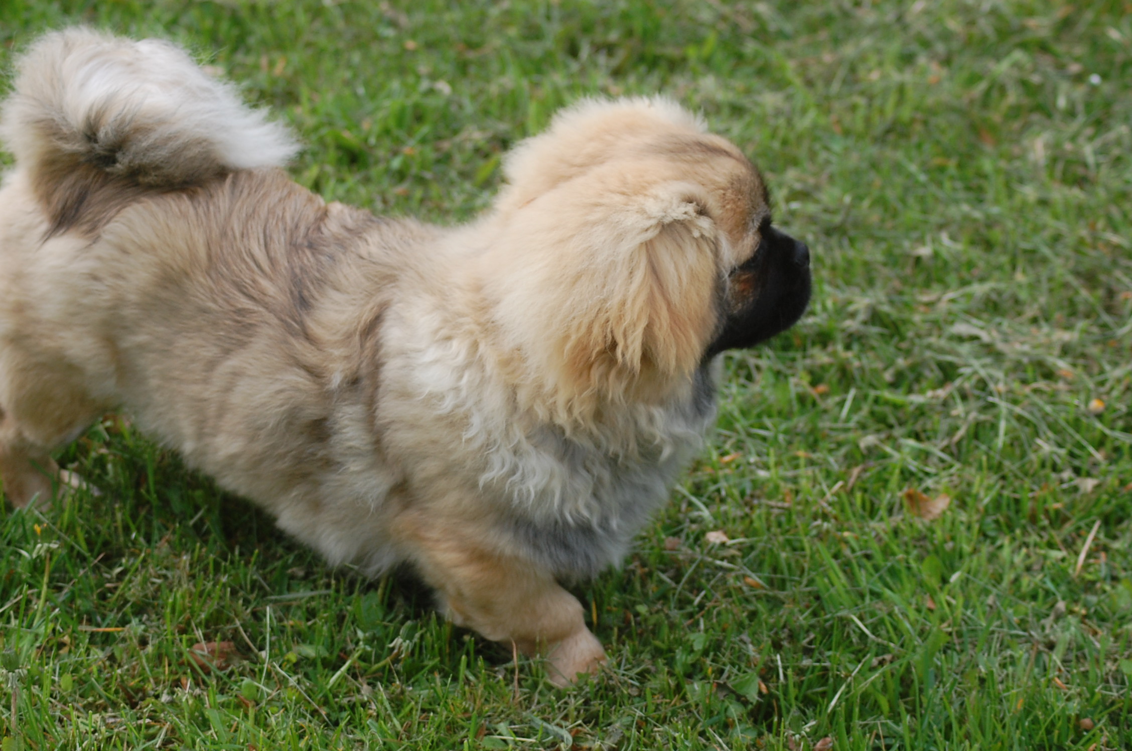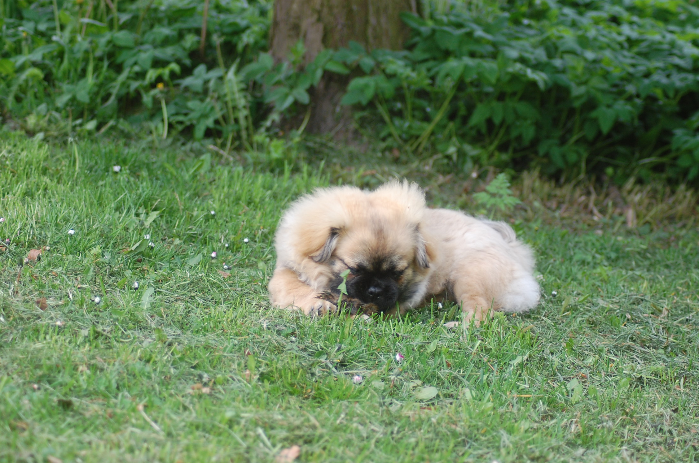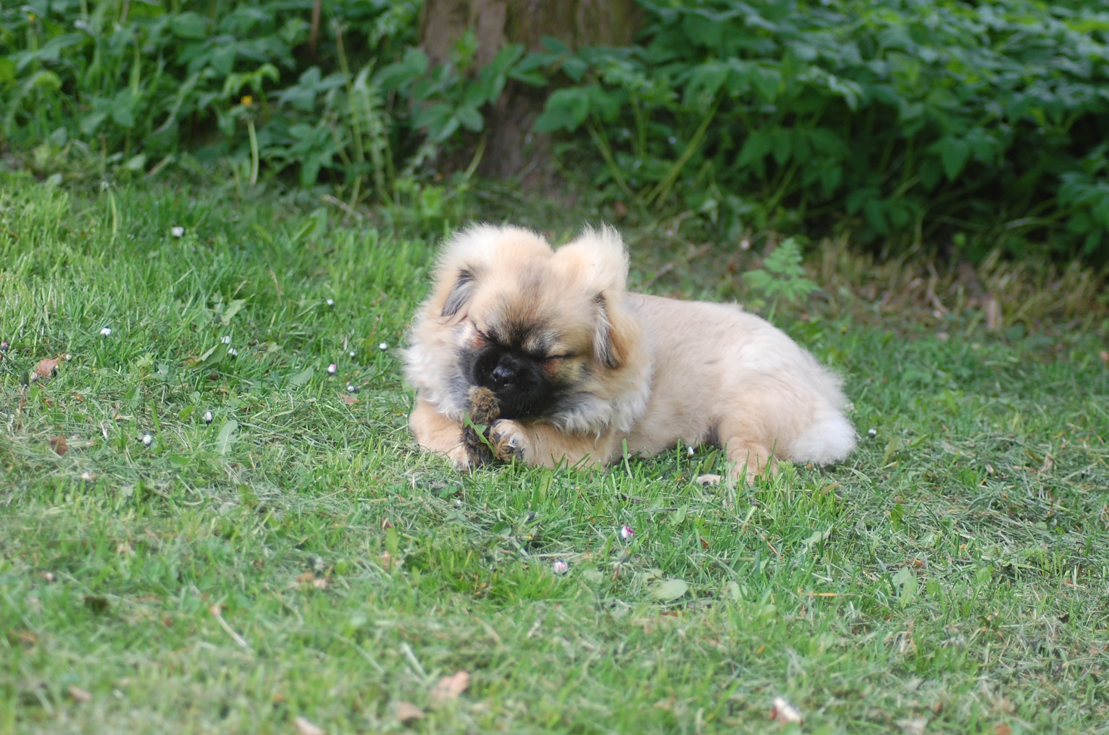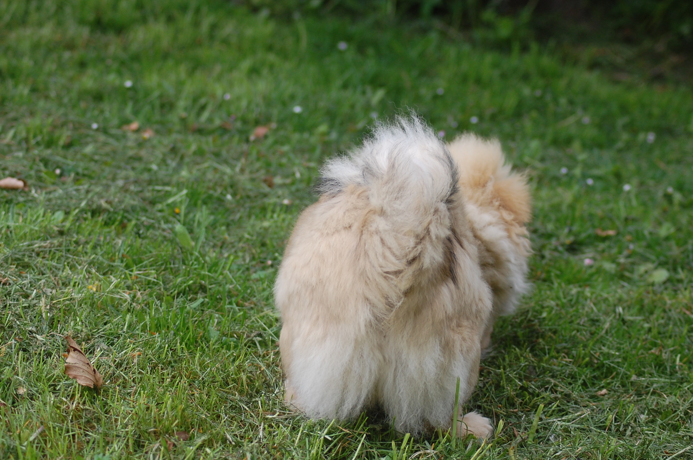 er blevet en rigtig lækker hund og jeg tror han ved det. Han er lidt svær at tage billeder af fordi han er så selskabelig at han helst vil være lige ved siden af mig hele tiden. Ude i haven fandt han et lille stykke skind som hundene har fået at lege med og de andre har tabt interessen for det men for Monty var det nyt, så det blev grundigt undersøgt indtil der var andre spændende ting der fangede interessen.