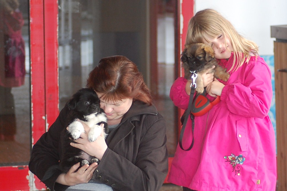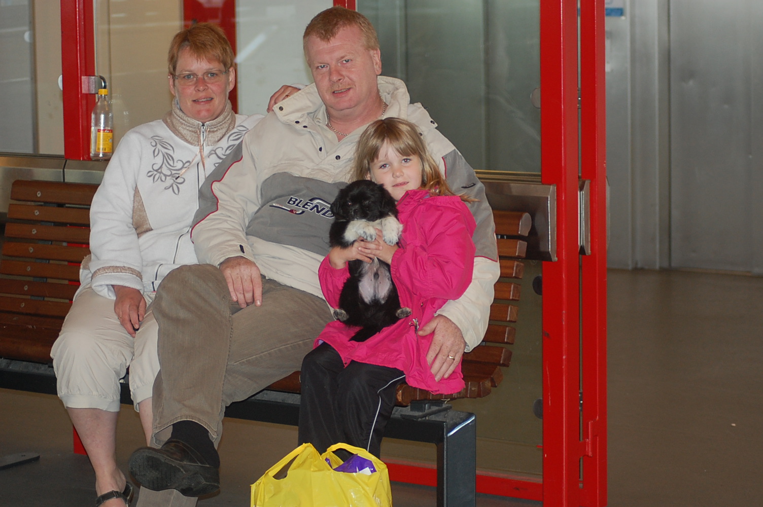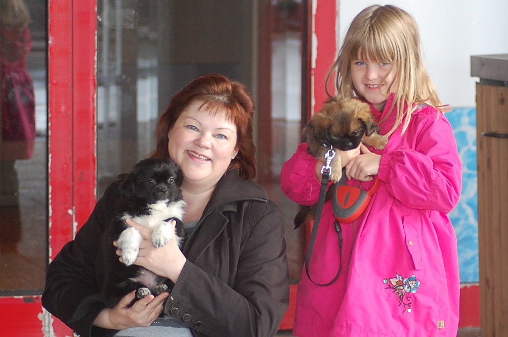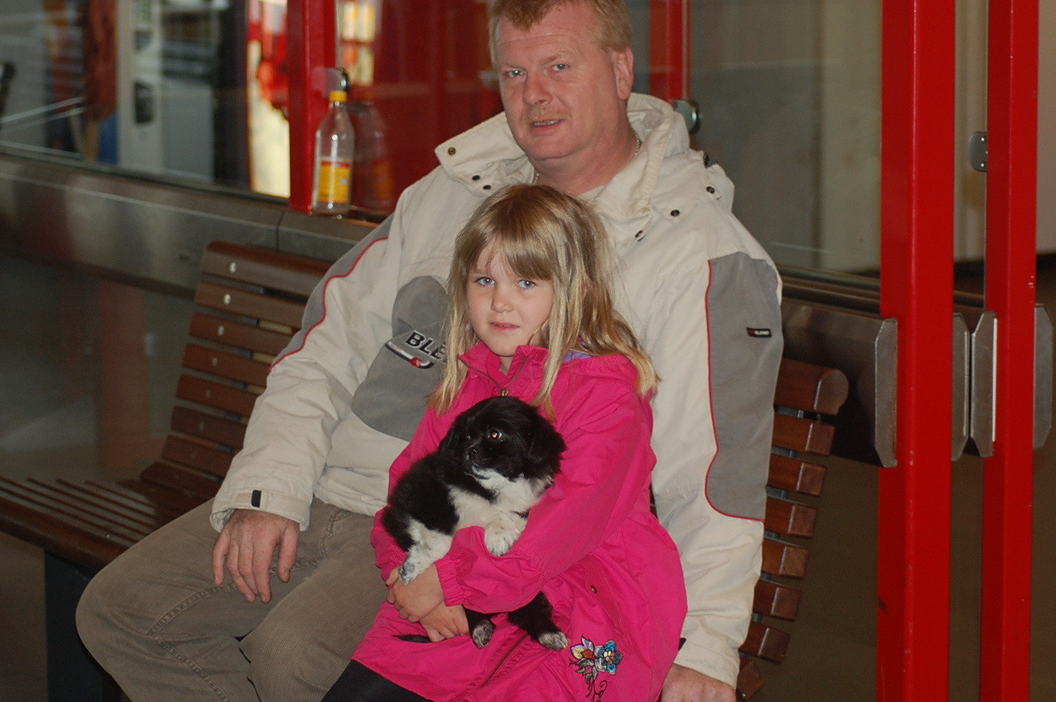 Det er virkelig en meget stor personlig sejr for mig at 2 års forhandlinger endelig er lykkedes. Mange ting har lagt sig i vejen for denne byttehandel, hvor jeg henter en lækker tævehvalp fra Kennel Tibbelabben til Danmark og til gengæld sender en ligeså dejlig ung hanhund derop. Jeg ønskede mig en tævehvalp der lignede moderen Tibbelabbens Lopez Maha, der dels er en af de meget smukke party colour der har et fuldt farvet hovede, men som også har en helt vidunderlig mørk rød farve på de farvede områder og med mange mørke dækhår. Min tæve er ikke party colour, men hun har den dejligste dybe røde farve og jeg håber hun har anlæg for party. Hannen jeg til gengæld sender til Norge er sort med lidt hvidt og han er hvad Ann-Karin ønsker sig til sit opdræt. Da hun så hans far Kosetibbene`s Oliver after Prins, var hun lige så sikker på, at det var efter denne smukke hanhund hun ønskede sig en sort hvalp til at forbedre sine muligheder for at få dejlige sorte hvalpe af eget opdræt. Som opdrætter er man jo ikke velhavende og da der er temmelig langt med mange transportudgifter, så var det jo meget heldigt at det vi hver især ønskede os, kom til verden så tilpas at vi kunne nøjes med på samme rejse at bytte hunde. Mon der er nogen der kan forstå hvordan panikken bredte sig i os , da vi efter at være stået op kl 04 , vel ankommet til ankomsthallen, så alle gå fra borde og der ikke var nogen glad opdrætter med en lille rød krudtugle til os at øjne ? og hvordan panikken forsvandt og glæden bredte sig da hun som den allersidste forlod båden ? Jeg håber inderligt at Herkules vil blive lige så elsket i Norge som Lady allerede er i Danmark. Hun er blevet præsenteret for flere opdrætteres bestand af tibber, fuldstændig uden problemer og med høj haleføring har hun vandret lige ind blandt de fremmede hunde.
