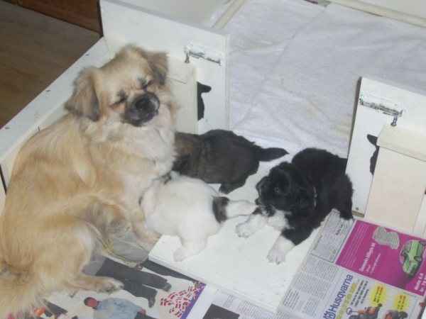 har Pia og hendes familie haft travlt med at udvide hvalpenes areal så der kan leges lidt mere nu hvor de ikke mere sover hele tiden. Det er jo tre forkælede hvalpe, der er så vant til at være i hænder at de kommer hen til kanten , og søger kontakt, når der kommer mennesker i nærheden af deres kasse. De trives rigtig godt og nu begynder man at kunne se den dejlige pels som forældrene også har, bliver længere og mere fyldig, så de nærmest ligner små velnærede bamser.