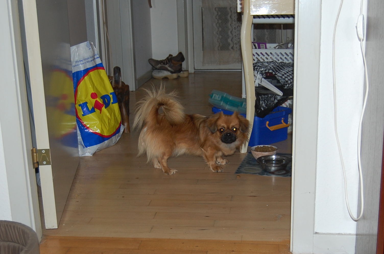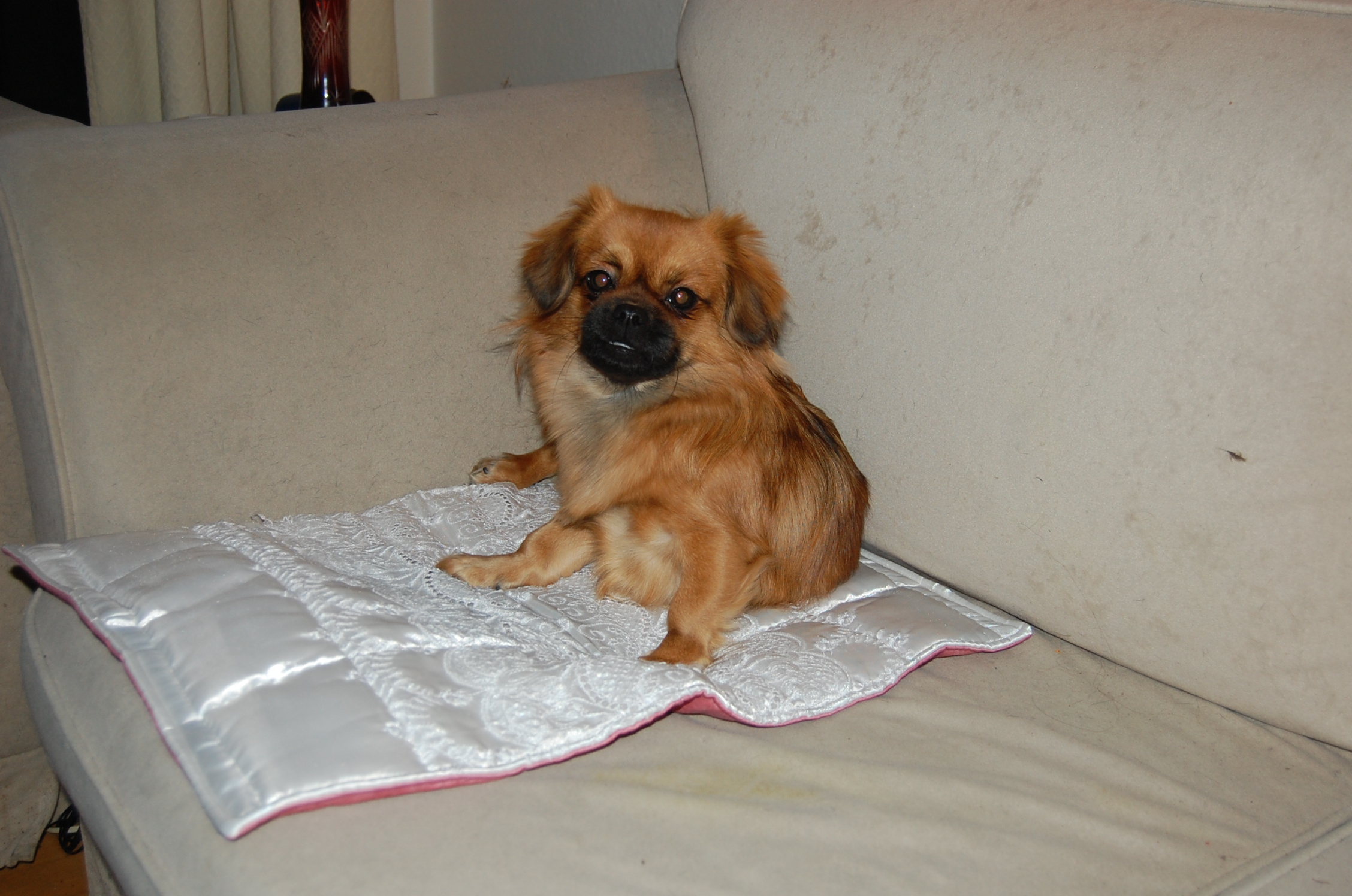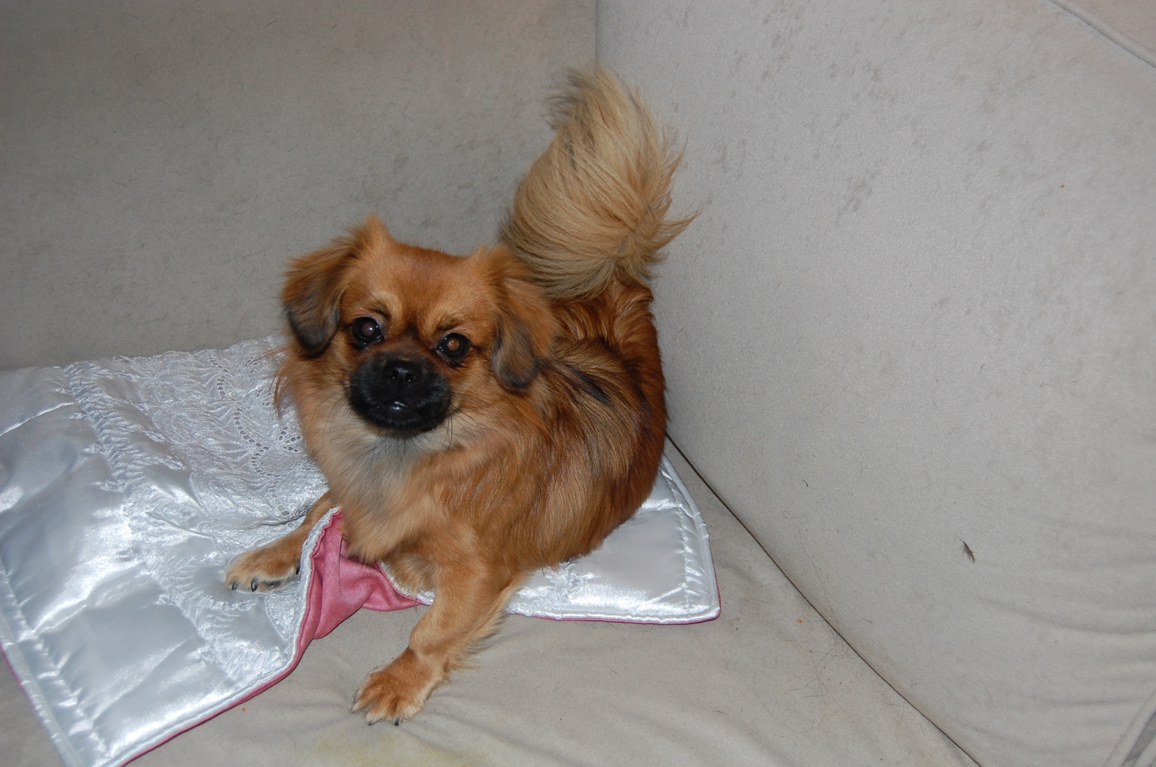 eller som hun hedder på stamtavlen Tibbelabben`s Lady in Red, har jeg været på besøg hos i dag fordi foderværten mente at hun helt sikkert var blevet gravid. Det er meget tidligt for hun blev parret d 10 + 11 nov, men efter at jeg har set hende, så må jeg nok indrømme, at det ser ud som om hun har ret i det. Jeg havde syet et lille tæppe til prinsessen og det blev hurtigt taget i brug da hun fik det. Både Lady og faderen til kuldet, Askim`s Goba, er meget dybt røde og da Goba i sit sidste kuld blev far til tre black og tan og to røde hvalpe, så håber vi jo på at der dels kommer bl/t og dels mørk røde.