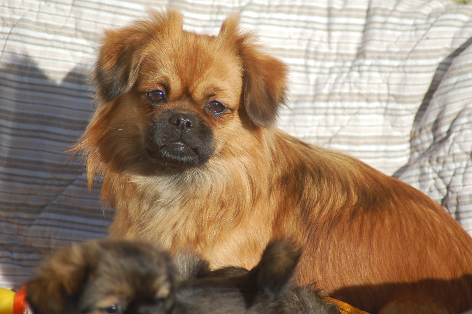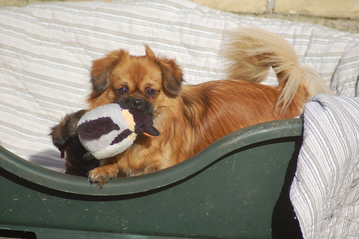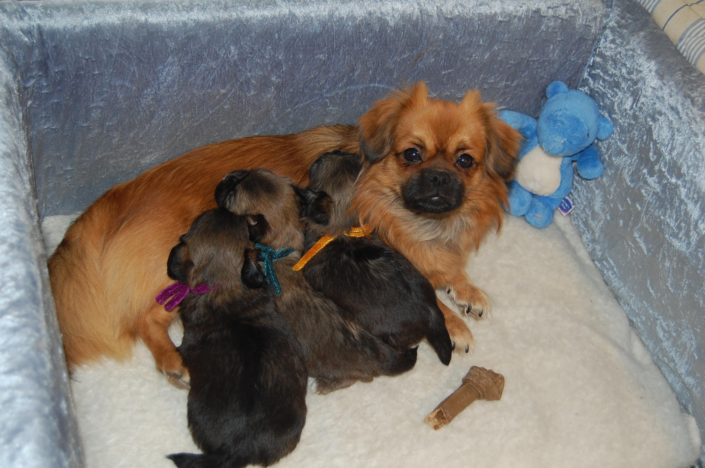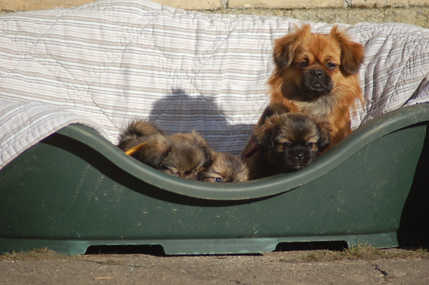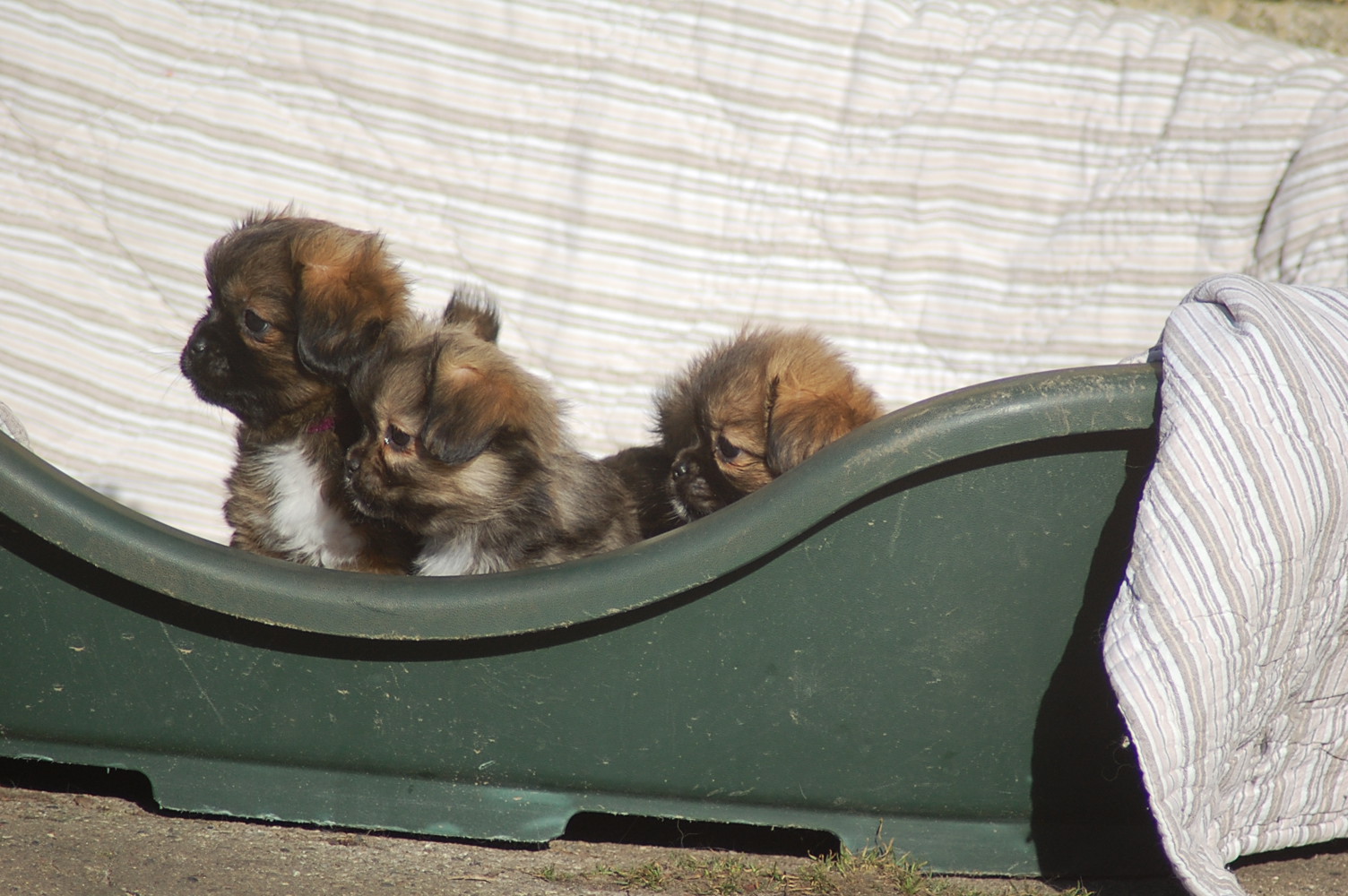 I dag kom solen og jeg fandt et sted hvor jeg kunne stille den store hundeseng så den var nogenlunde i læ, så hvalpene måtte lige lidt udenfor og få lidt frisk luft. De fik selvfølgelig deres mor med og lidt legetøj og så har man faktisk det hele når man er en lille hvalp.