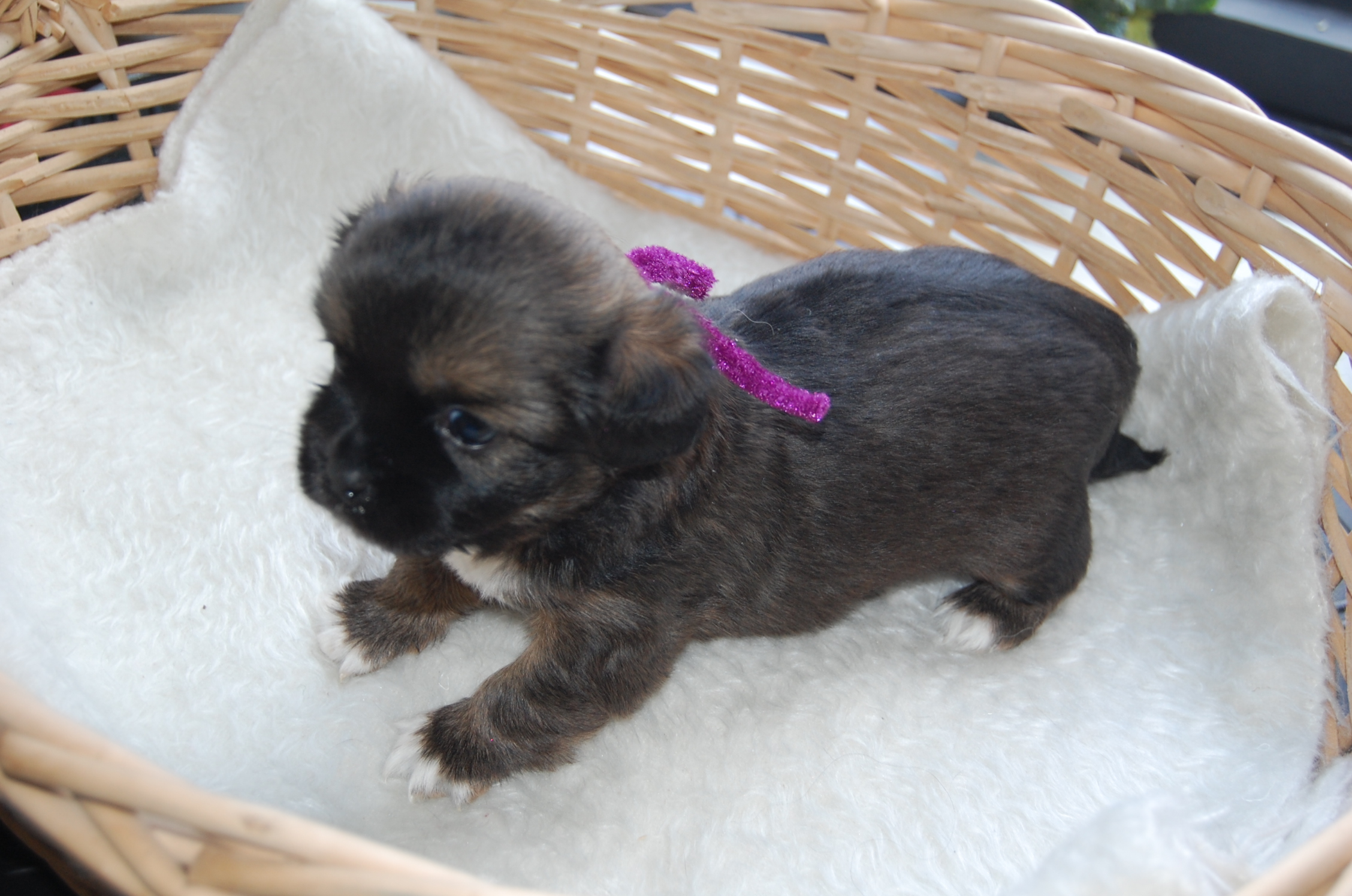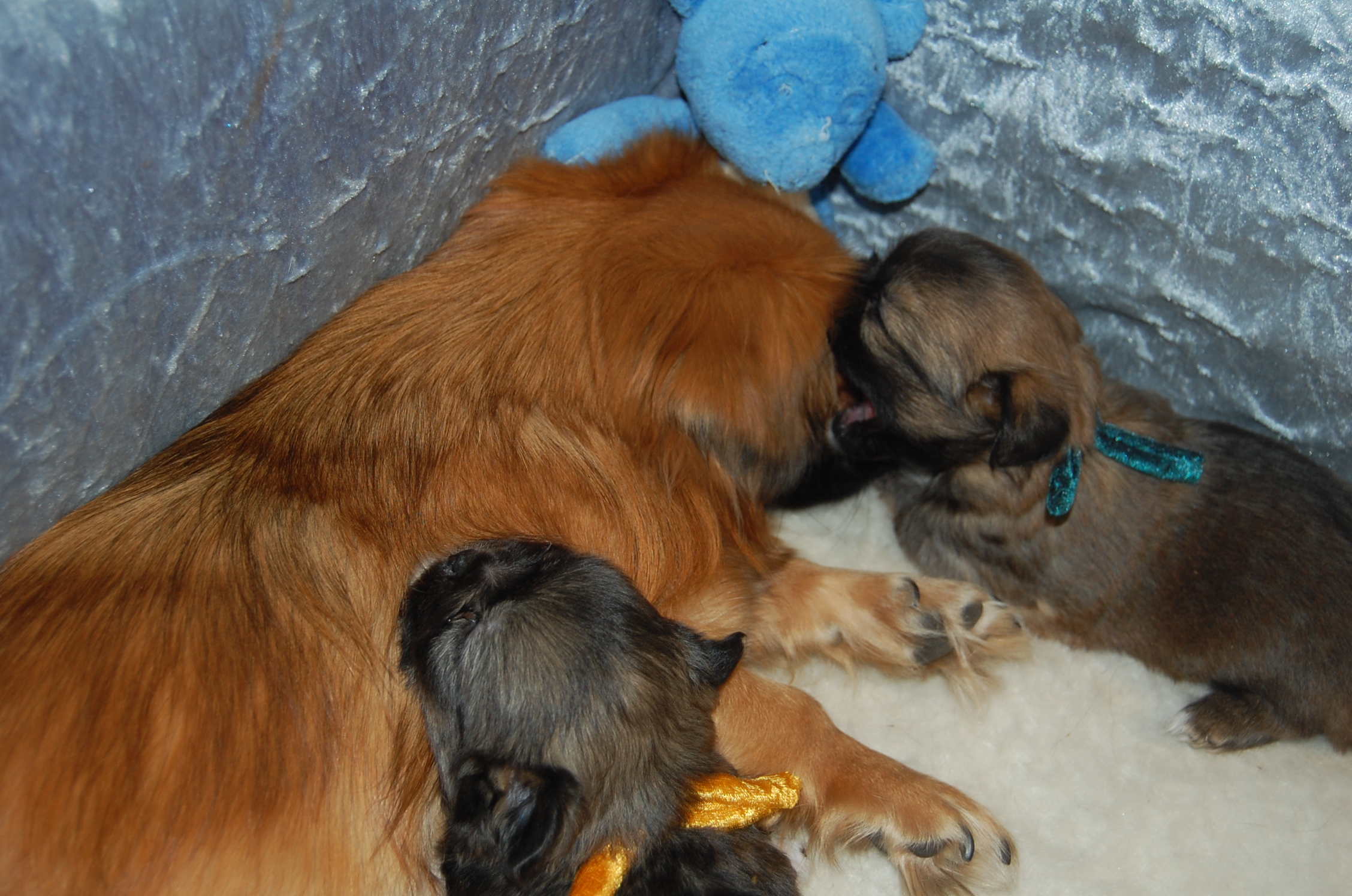Lige siden jeg første gang så en party colour er det den farvevariant der har stået mit hjerte nær, og jeg har drømt om , engang, at lave en party med sundhed i top og lækkert temperament, ikke for stor, lækre bevægelser og pels, mørk mahogni rød / hvid farve, god udstrækning af de farvede arealer, fuldt farvet hovede, ja kort sagt alt hvad hjertet kan begære af en tibetansk spaniel i party colour. Om jeg har nået det hele ved jeg jo ikke endnu, men i Lady`s kuld er der en tævehvalp, der ser ud til at være et