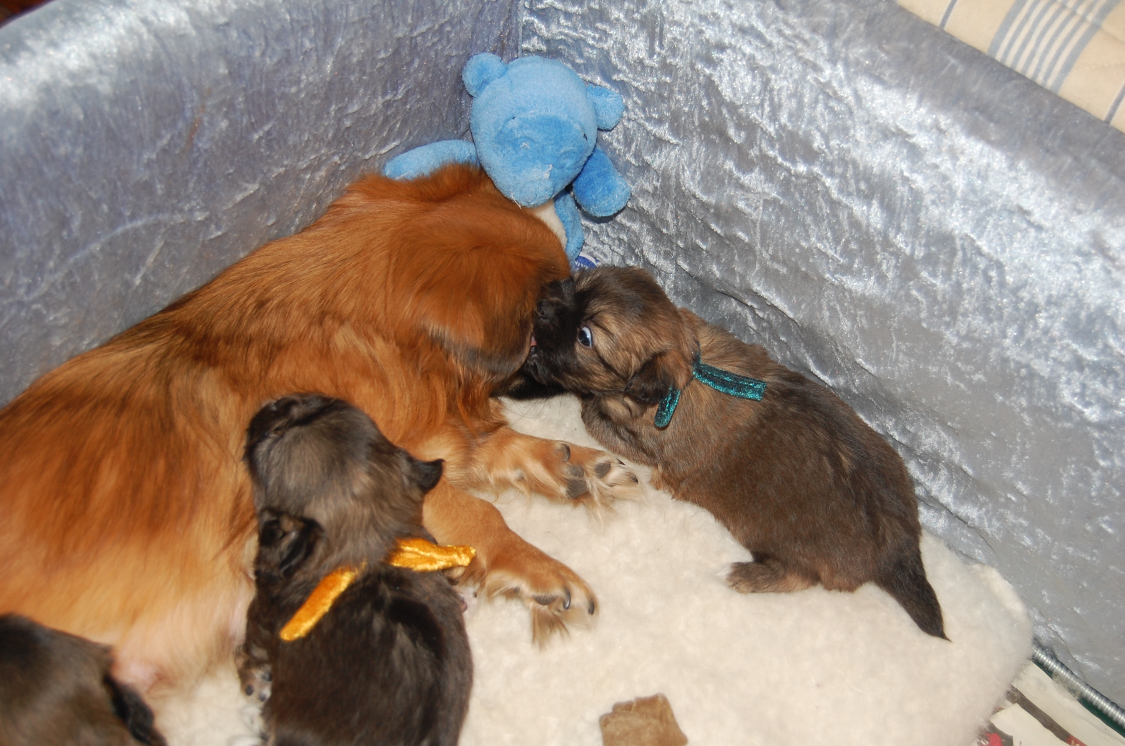 vokser og nu bliver de sjovere. De er kommet op og stå på benene og de kigger ud på verden med store forundrede øjne, så nu er det lidt nemmere at tage billeder af dem. Lady er en rigtig sød og tålmodig lille mor, selv når en fræk hvalp begynder at gumle på hendes ene øre, finder hun sig bare lige så stille i det.