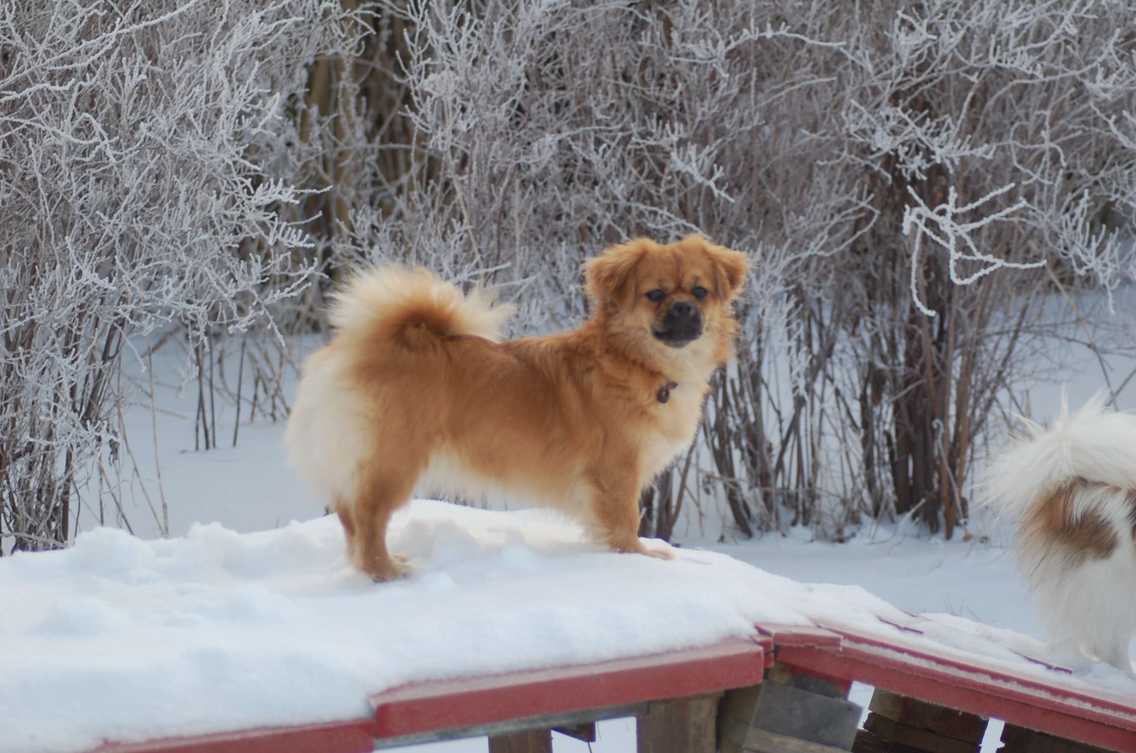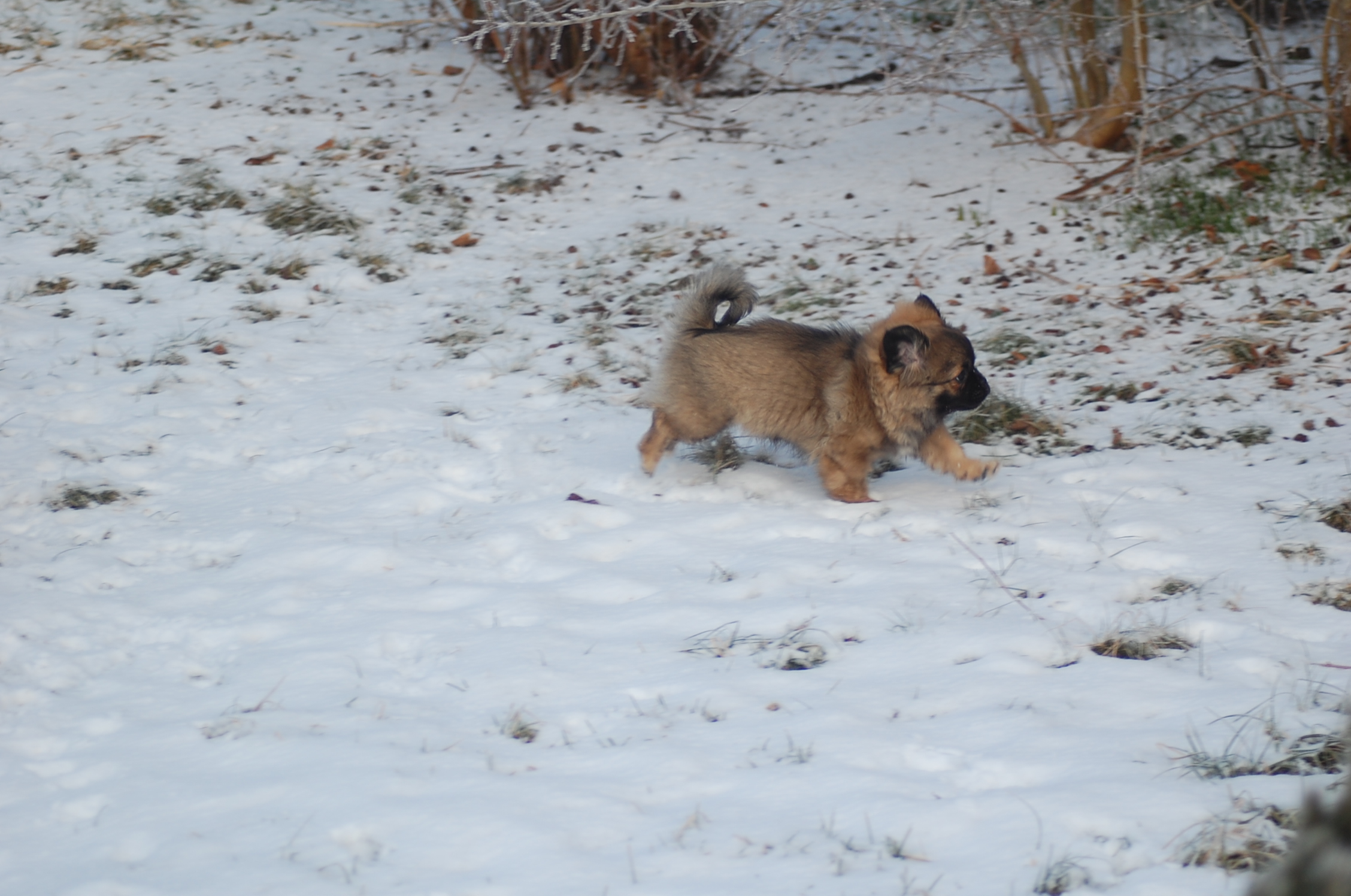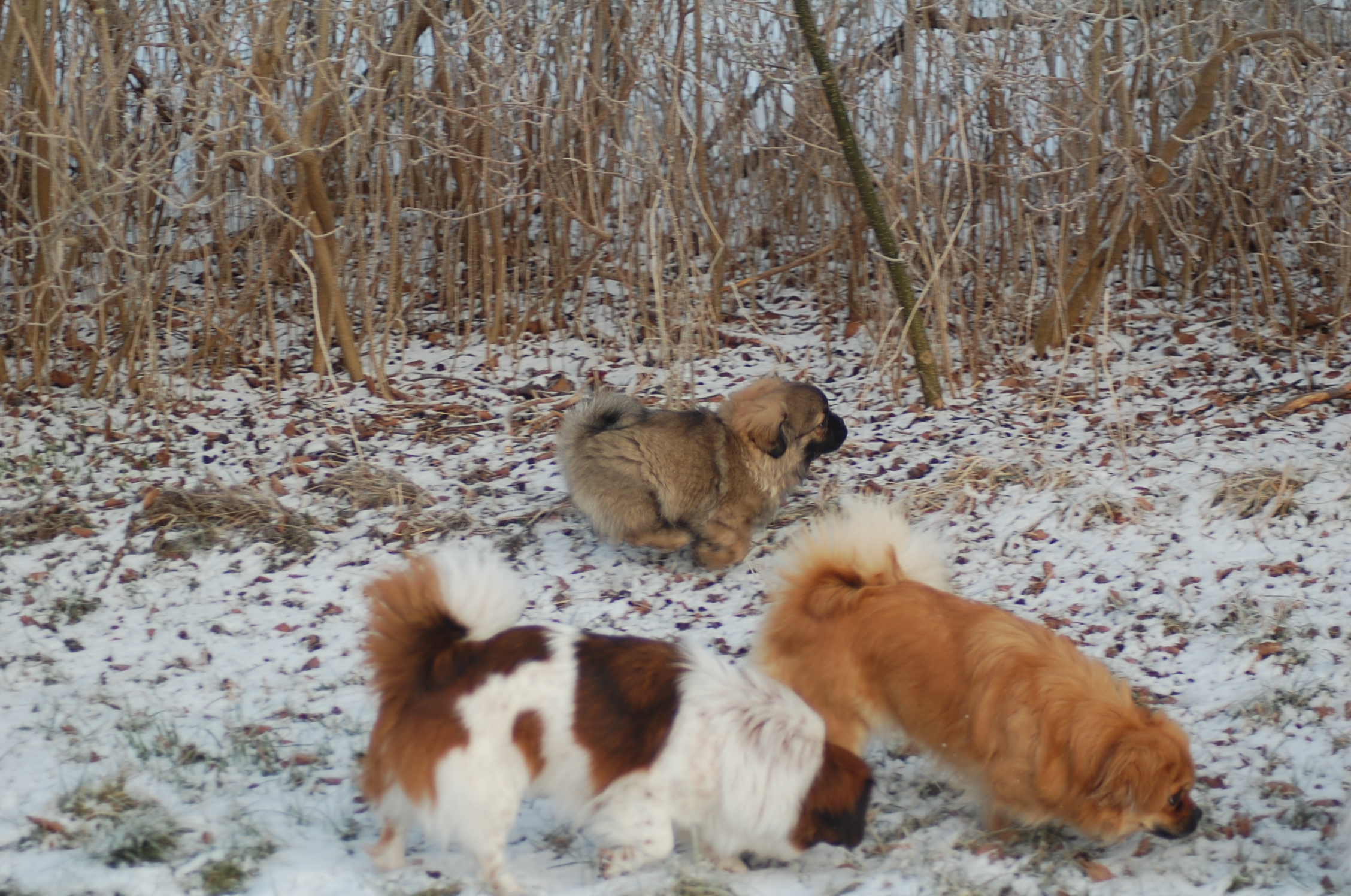 Efter mange dage uden sol nyder hundene at komme ud i haven når solen skinner og det ikke blæser. Det er vanskeligt at tage billeder når hundene har så meget krudt i sig de skal have brændt af, men der blev da nogen stykker der ikke blev helt tågede.