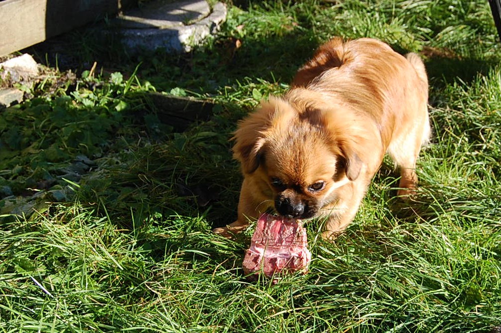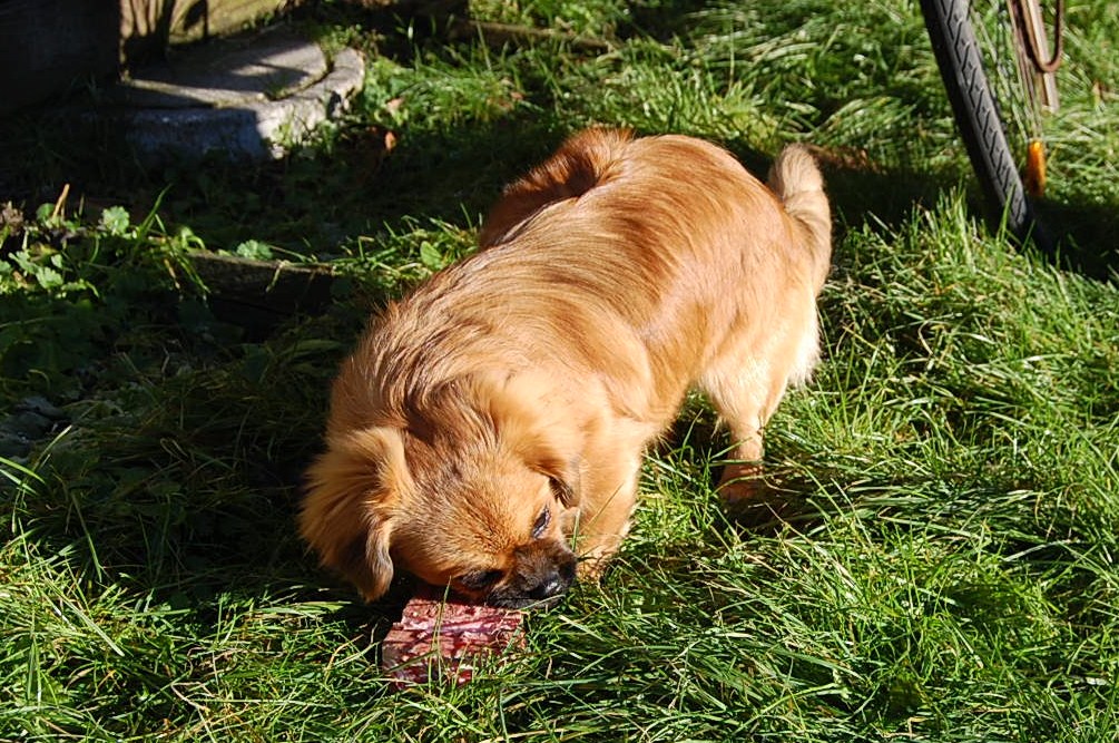 er bare det helt perfekte navn til min lille tibbe, for RØD kan man roligt sige at hun er.Jeg håber på at hun udvikler lidt mere ” ladylike ” manerer som hun vokser til, for endnu har hun alt for meget energi til at navnet passer helt 100 %. Det var en god ide at give hende et råt kødben for det var hun så optaget af at hun var til at få nogle gode billeder af.