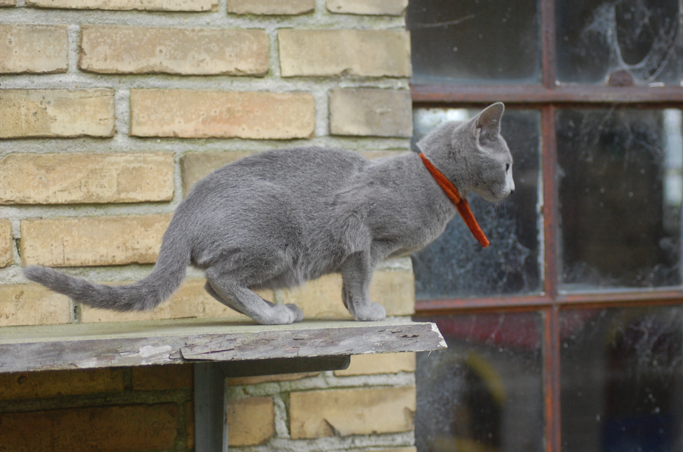 Jeg har jo en dejlig stor gårdsplads på 350 m2 med bygninger på alle fire sider, og det har jeg længe syntes at mine katte også skulle have fornøjelse af. Jeg har sat hegn mellem bygningerne i mange omgange, men uanset hvad jeg fandt på , så varede det ikke ret længe før mine russere fandt ud af at komme ud derfra. Det hegn jeg lige har pillet ned var 3 m højt med indadskrånende kant og løst hængende flagre hegn i toppen, men der var intet der kunne holde kattene inde. Problemet med at kattene smuttede ud mellem benene